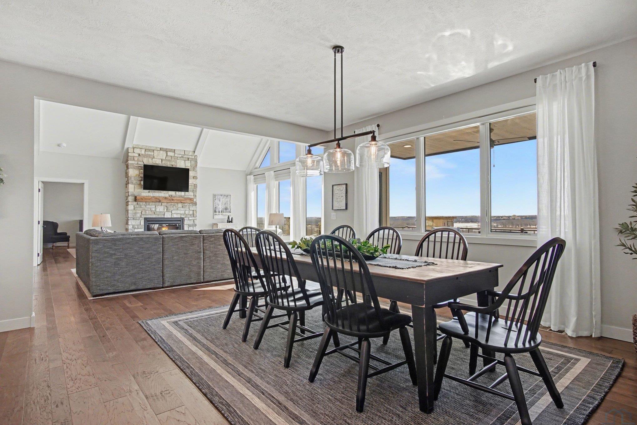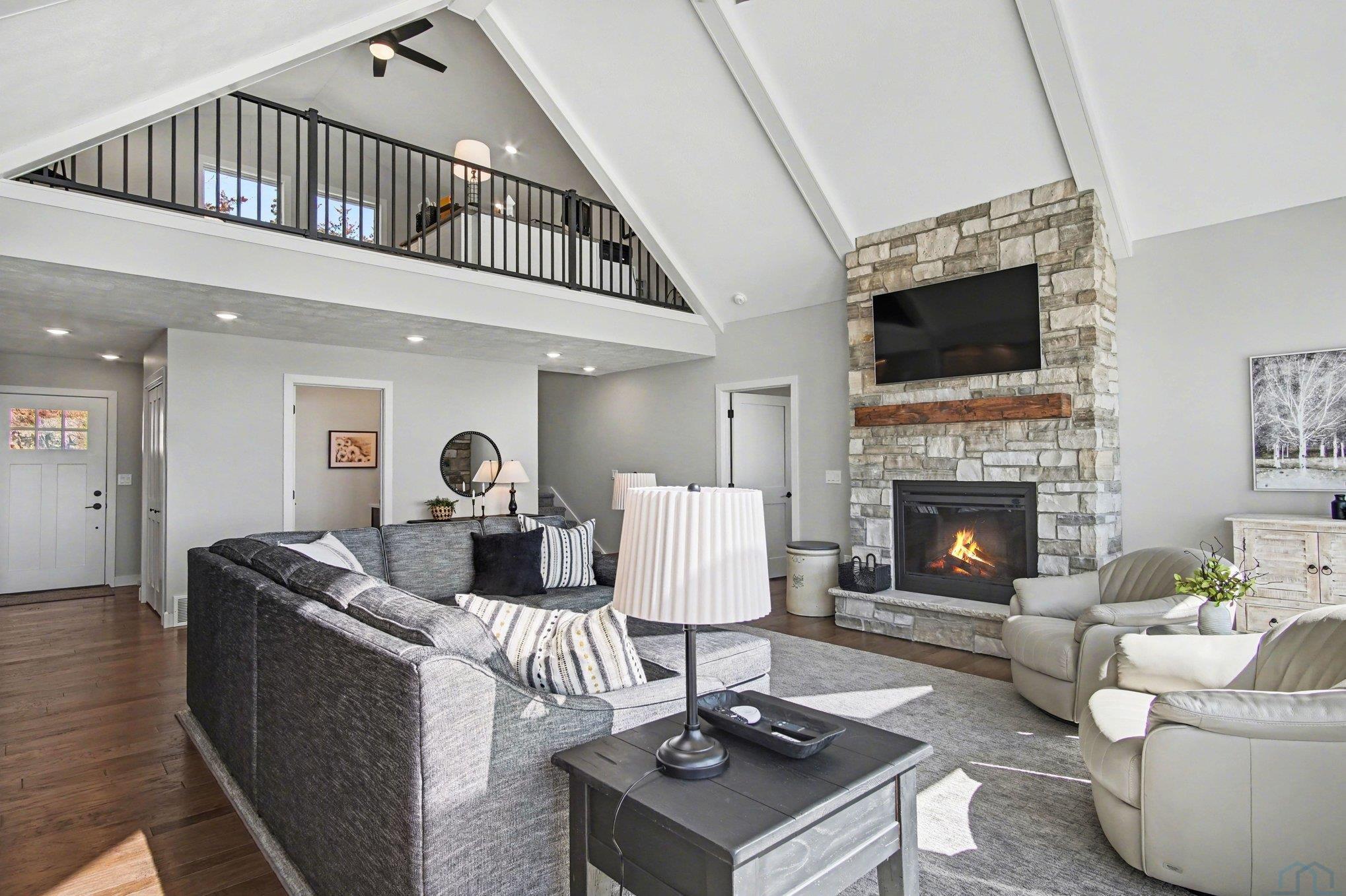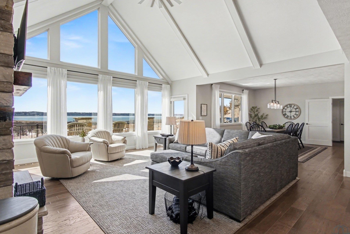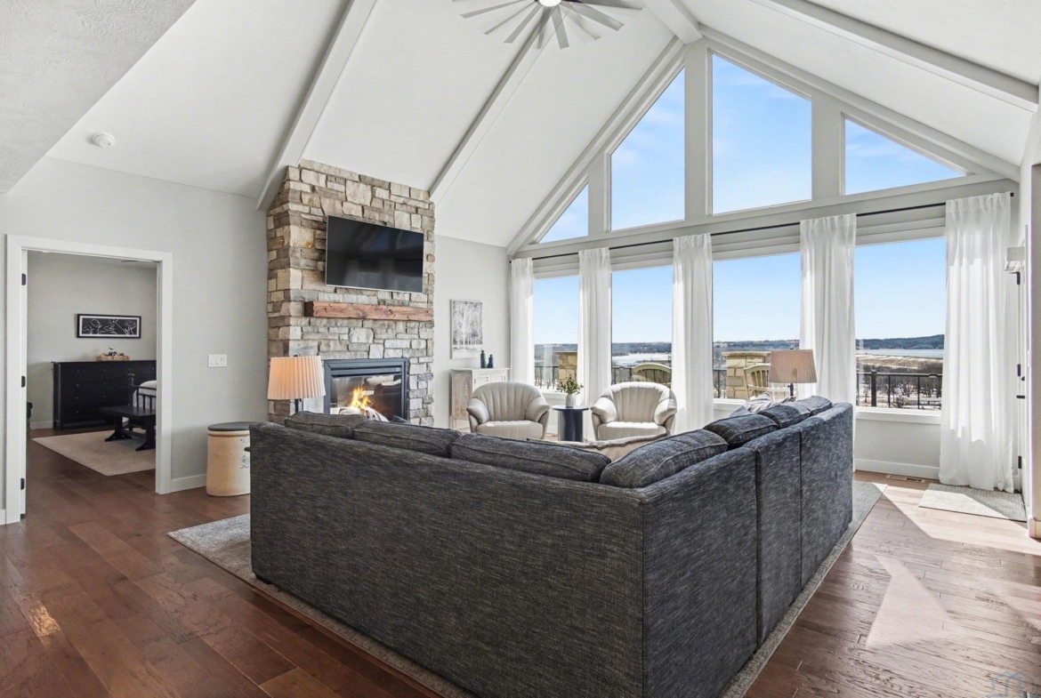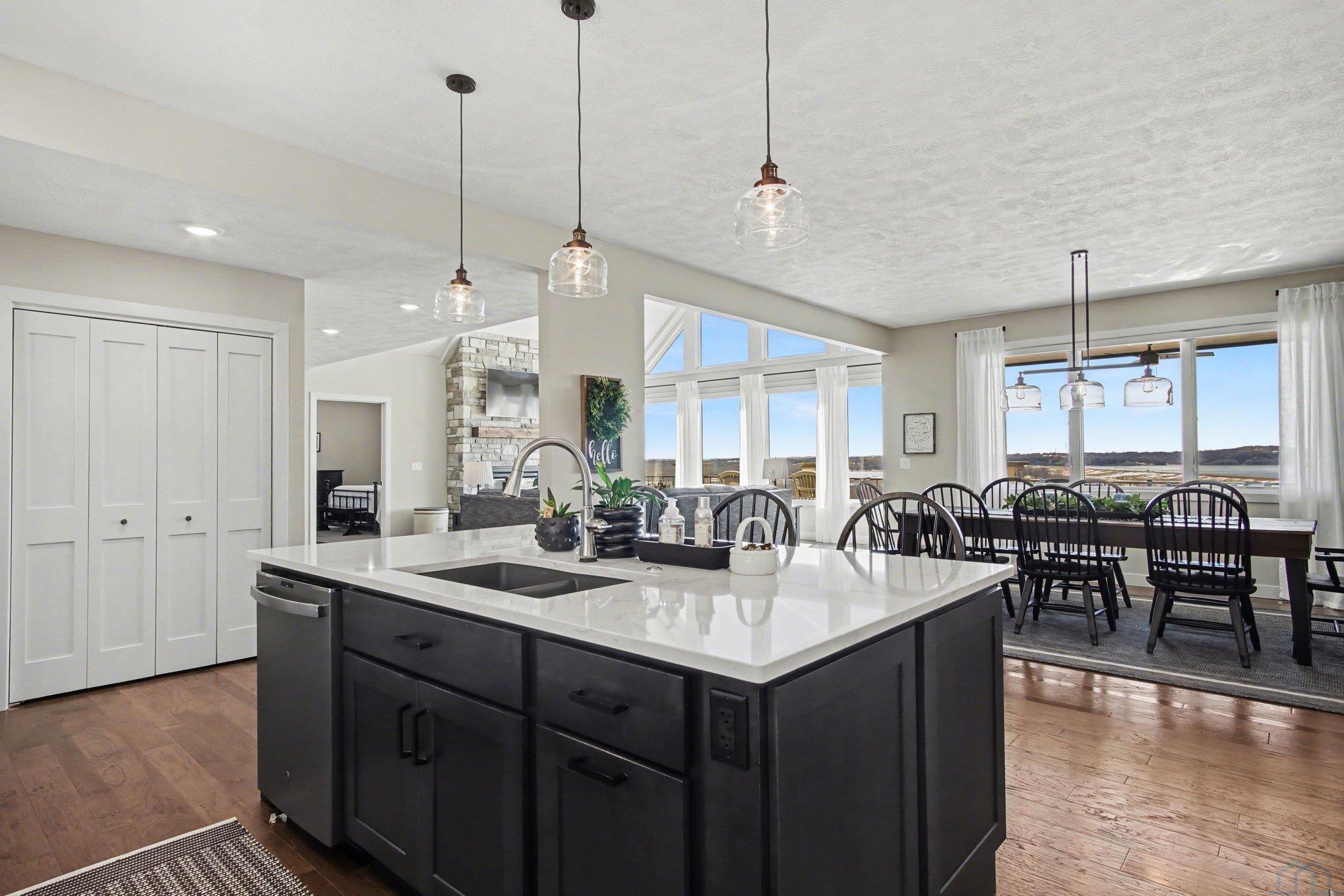 EXPERIENCE refined living in this beautifully crafted home set on approximately one acre in the desirable lake area. Offering over 4,300 finished square feet, this spacious residence features four bedrooms and four bathrooms with a thoughtfully designed layout that blends comfort and style. SPECTACULAR lake views The main level offers invited living space with stone fireplace and showcases an open living space that flows seamlessly into the kitchen and dining area, highlighted by a large center island. The private primary suite offers a well-appointed bath, spacious walk-in closet with convenient main floor laundry. The finished walkout lower level expands the living space with additional bedrooms, bathrooms, and a generous family room complete with a wet bar—perfect for entertaining or hosting guests. Additional highlights include a heated attached garage with over 1,400 square feet, underground sprinkler system, and scenic water views. This impressive property offers modern construction, exceptional space, and a prime location near the lake.