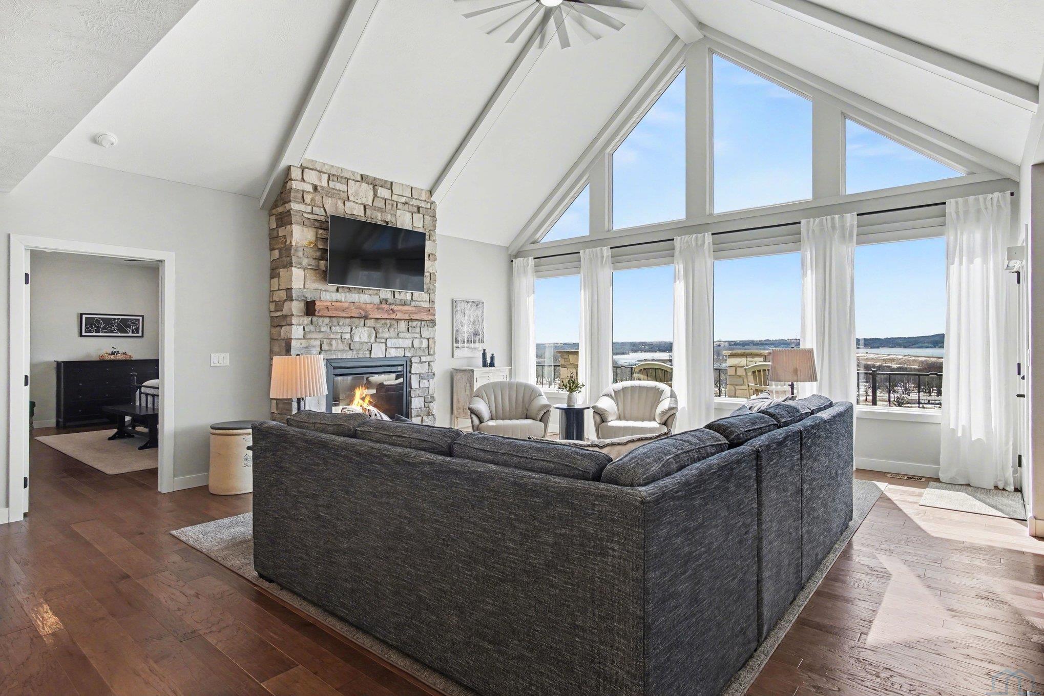 | Living | Main | 18x24 | Hardwood floors, window wall with lake view, stone fireplace |