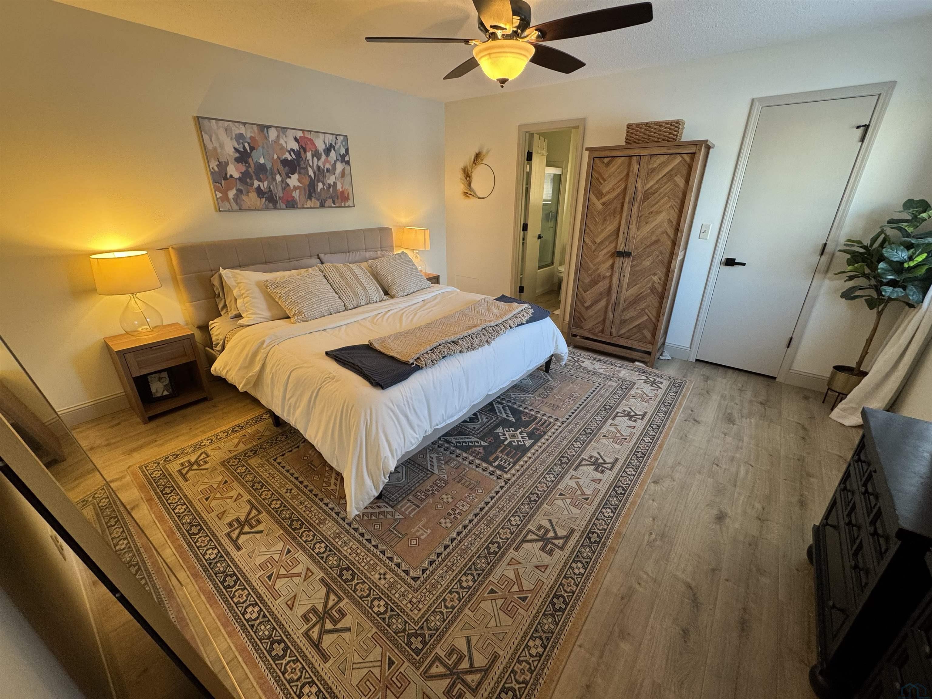 | Bedroom | Main | 14 x 13 Primary Bedroom | WI closet, LVP wood flooring, 5' 9" x 7' 8" Primary Bath |