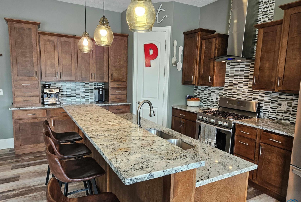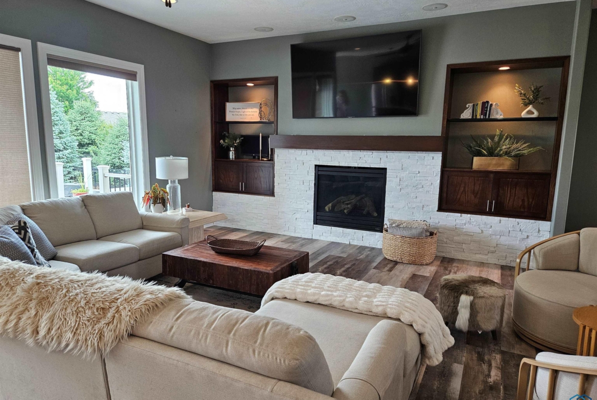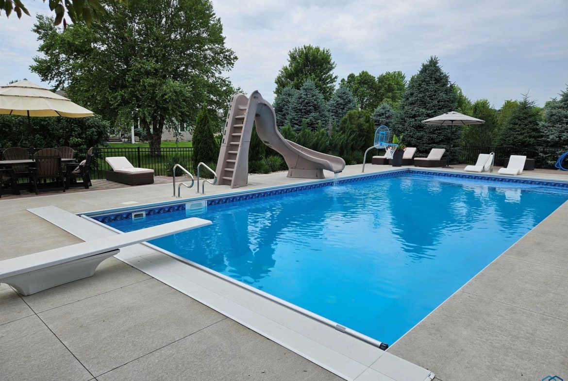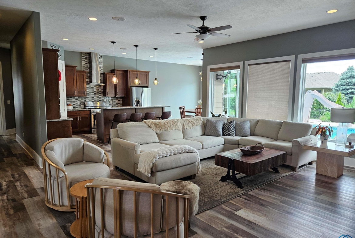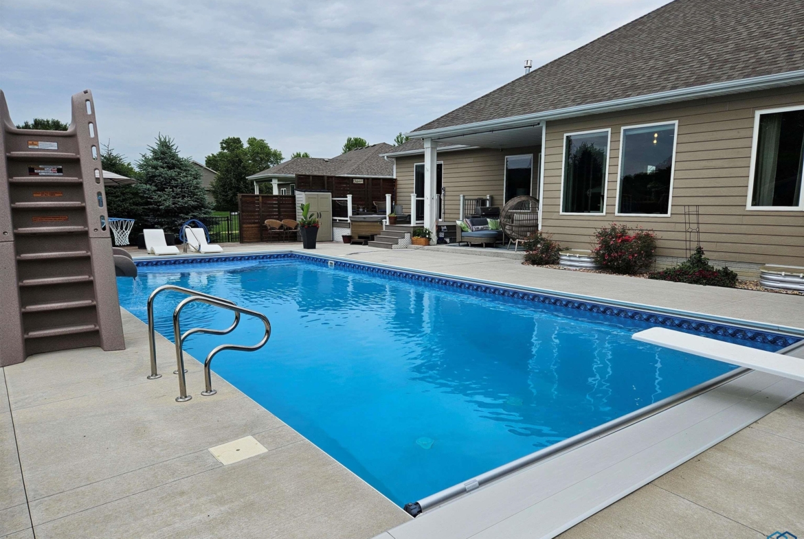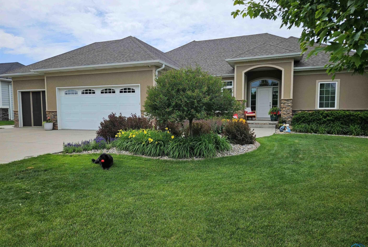 Pride of Ownership – 2470 sq ft on main floor, exquisite ranch, with approximately 1950 sq ft finished in lower level, all on gorgeous treed and private cul-de-sac lot in beautiful Dakota Dunes Country Club neighborhood. Tons of updates, and the backyard oasis is a phenomenal show-stopper. Walk-out to covered patio, with view of heated 20×45 salt water pool, slides, paver patios, fenced yard, mature trees architectural privacy panels and hot tub right off the primary suite. Great way to relax after a long day and premium privacy galore. There are 5 legal bedrooms, 3 on main, 2 in basement and three full baths. Open concept main floor with 10′ ceiling height and 8′ doors throughout, new LVT flooring throughout living area & primary suite. Open kitchen w/ island & granite counters with tile back splash, corner pantry and dining area w/ sliders to access the covered patio. Large windows make this home bright and airy. Beautiful gas FP/painted stacked-stone with built-ins in living room. Formal dining room or music room is off 8×8 tiled foyer. Awesome primary suite w/ LVT, slider to hot tub & pool, and bath including tiled walk-in shower, soaking tub, dual vanity and radiant heat in floor plus 8×13 walk-in closet. Main floor laundry with granite counter/sink, wall cabinets, a doggie door to garage plus a rear entry coat closet. The basement has been nicely finished with a large gathering/living room, tiled floor in the wet bar/entertaining area, a tiered-seating theater room, two bedrooms and a full bath with radiant heat in floor. Gorgeous backyard w/ 20×45 heated, salt water pool, hot tub and architectural privacy screening, concrete edging/rock beds everything installed 2020, and amazing garage with single entry door added to backyard, doggie door and 3rd stall w/ screened overhead door too!! You have got to see this one!!!