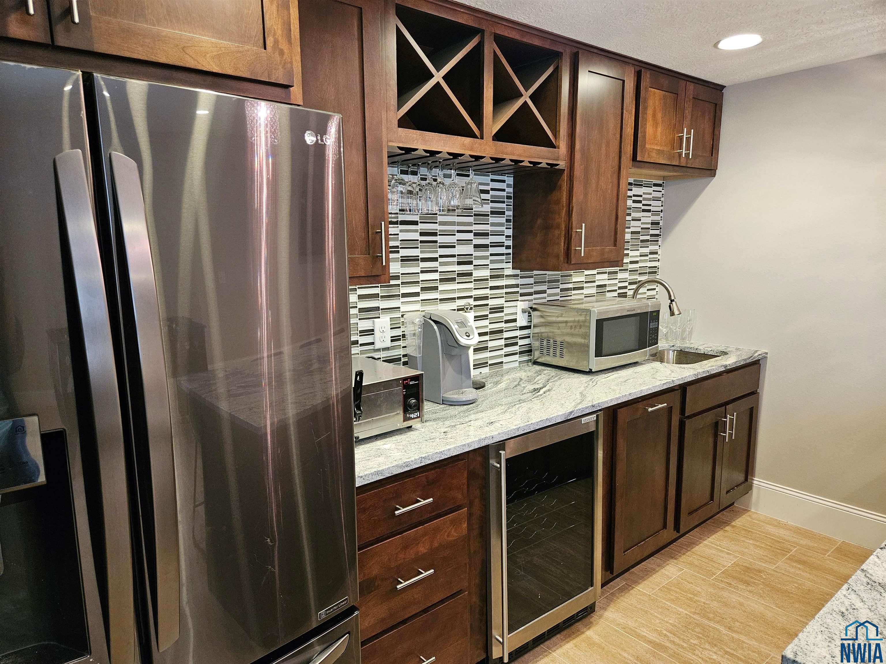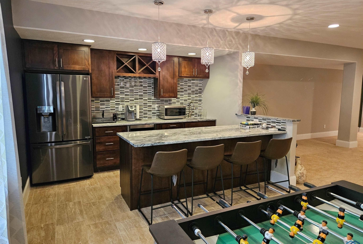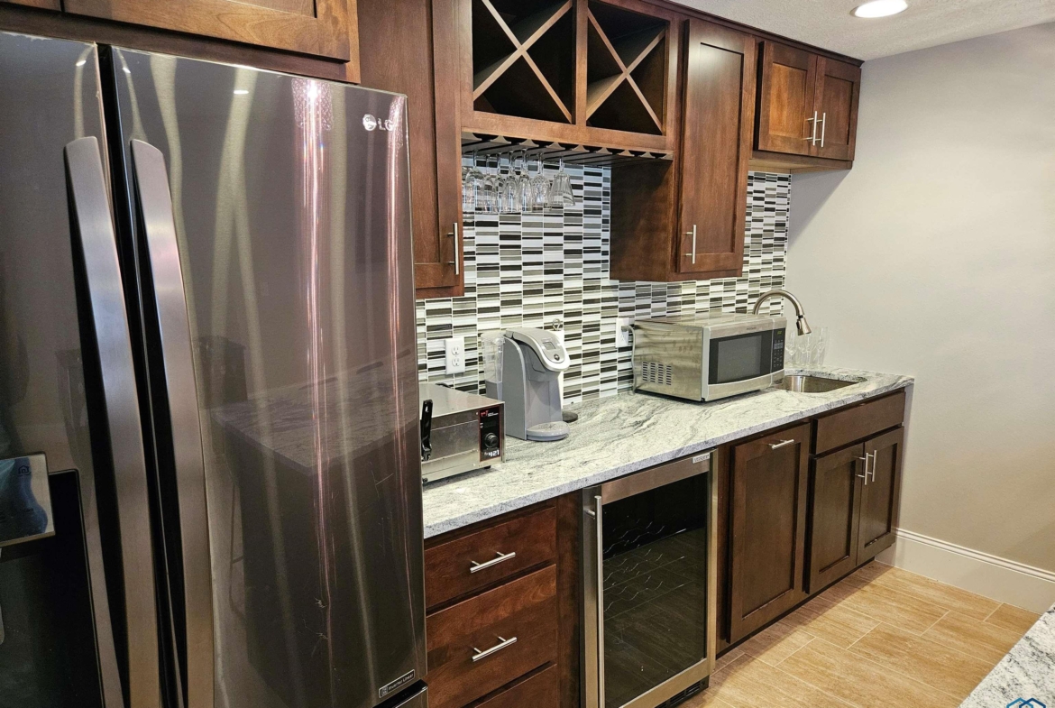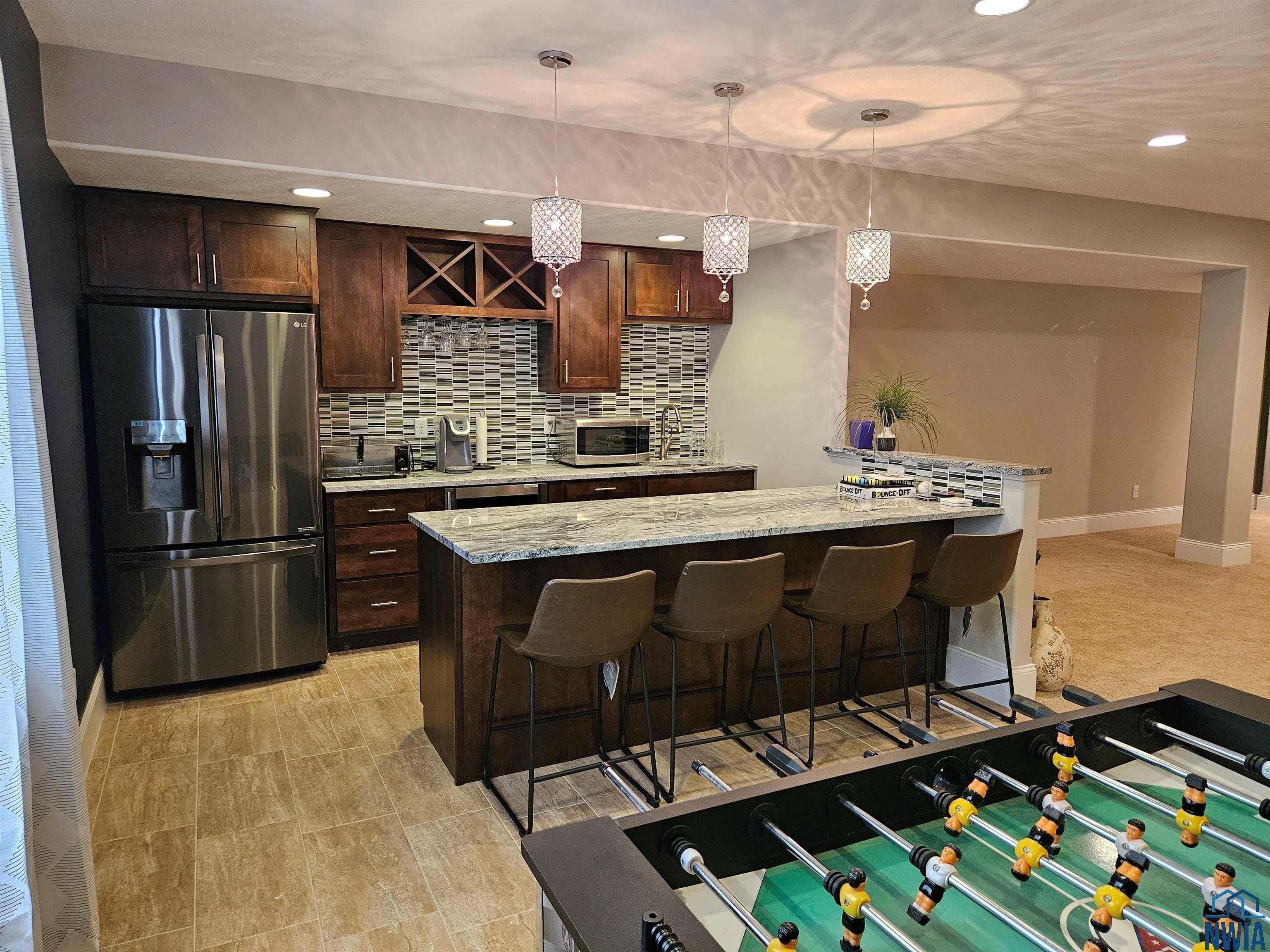 LivingBasement12x20Wet bar, granite, cabinetry, tiled dining area