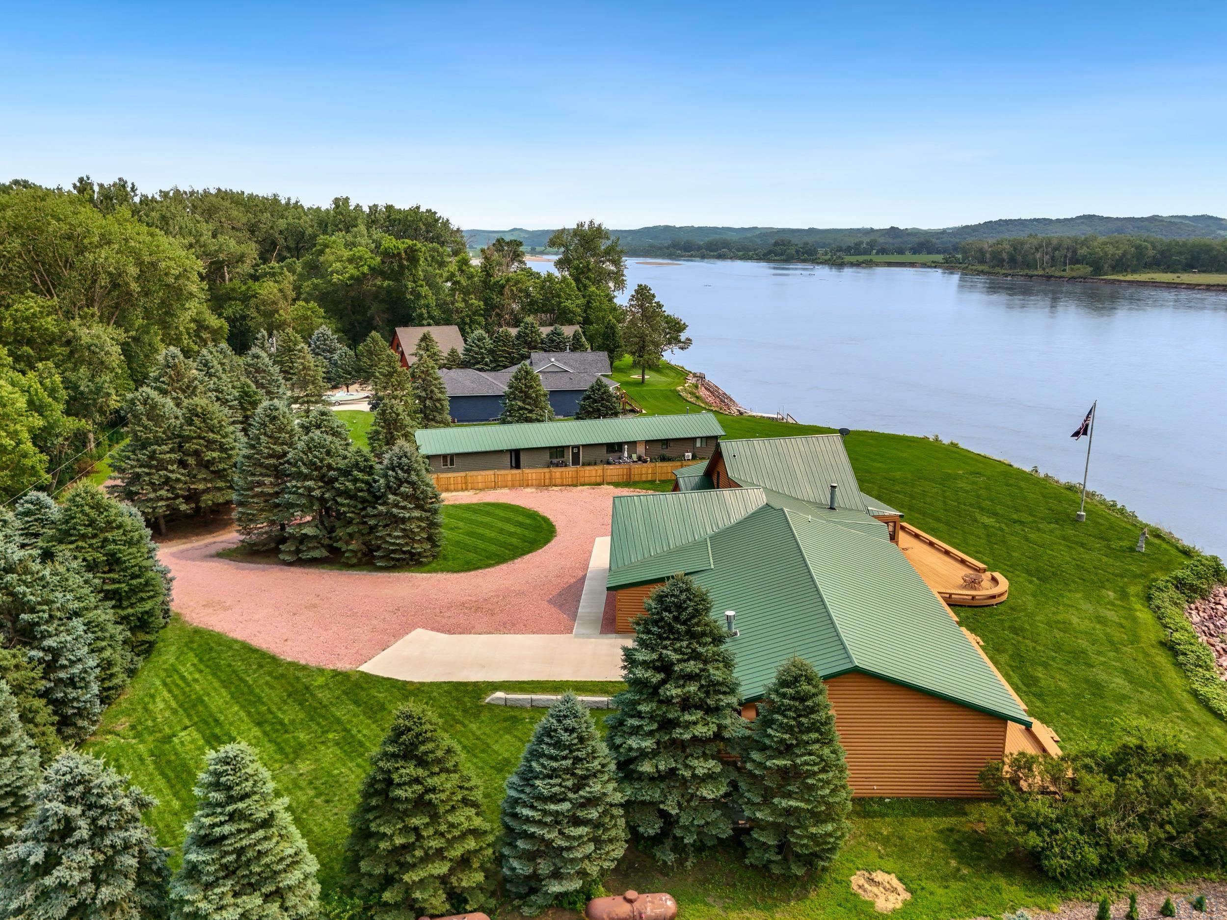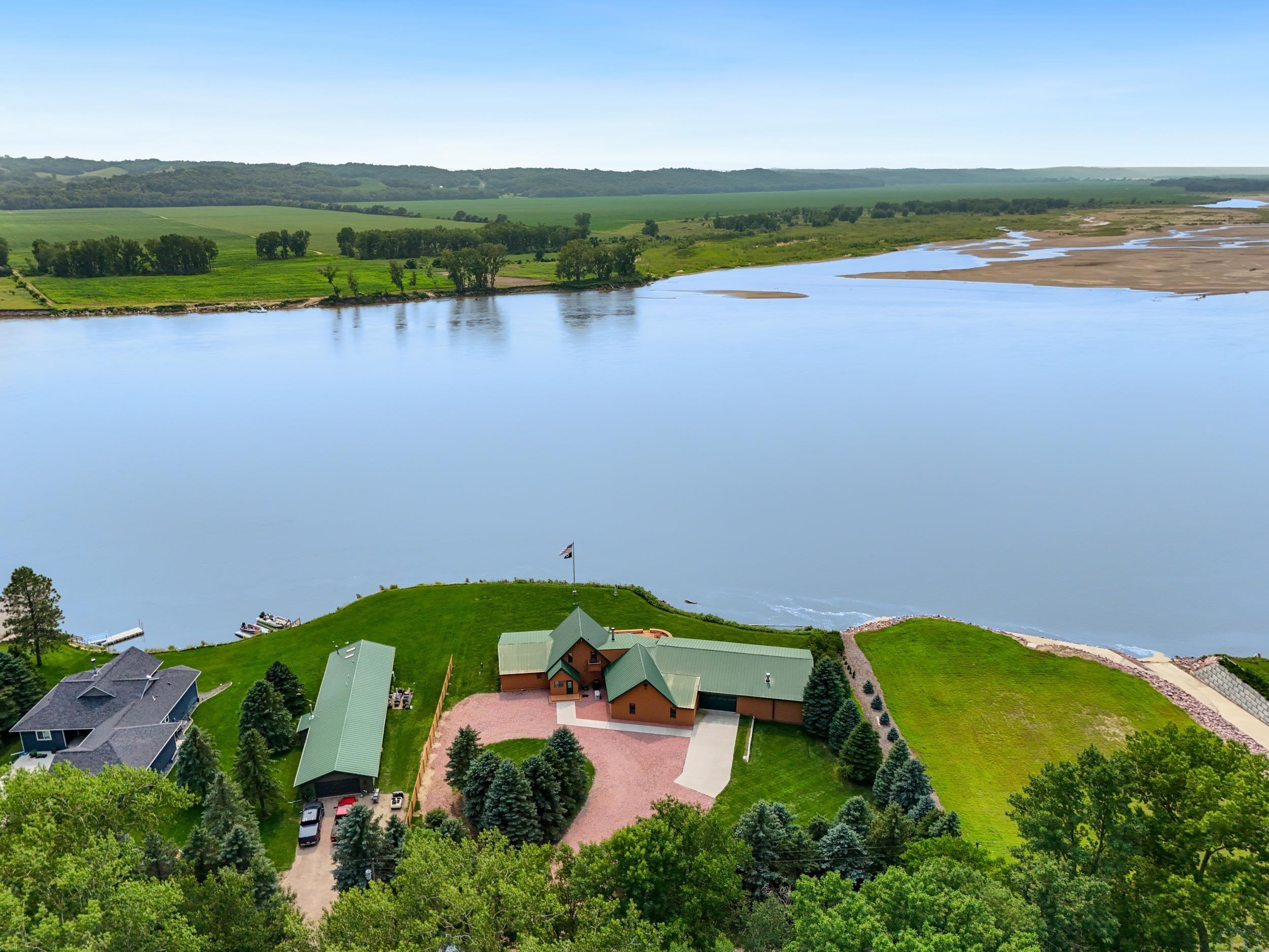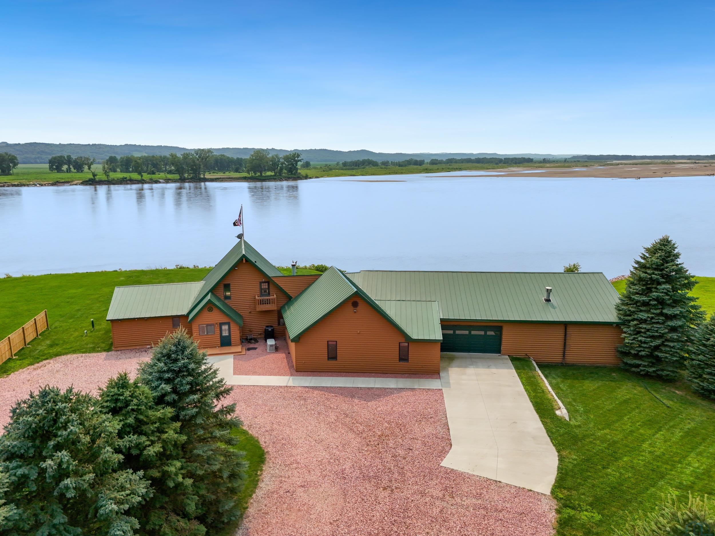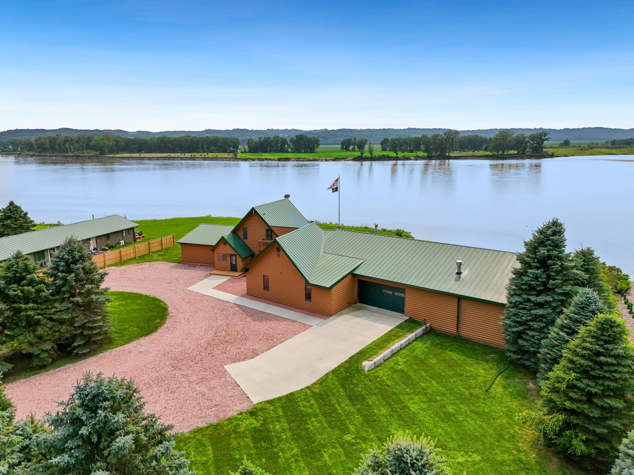 You don’t just buy this home—you buy the view, the vibe, and the bragging rights. Perched on one of the last untouched stretches of the Missouri River (Mile Marker 769), this custom retreat with 5224 square feet gives “lodge life” a luxury twist. With panoramic river views, 1.02 acres of level, landscaped grounds, and a rock-solid shoreline lined with pink granite, this place wasn’t just built—it was designed to last. Step inside and you’re met with soaring wood ceilings, a wall of windows, and a riverfront backdrop that’ll stop you mid-sentence. An area once occupied by an indoor pool and is now a 2622 sq foot entertainment room takes center stage—heated by a geo-thermal system for year-round enjoyment. The theatre room is fully equipped, the game room includes the pool table. The vibe? Rustic comfort with a dash of “wow.” Other perks? 3+ bedrooms, 3 full baths, two-way gas fireplace, multiple living zones, a massive primary suite with walk-in closet and bath, all-seasons porch + sun-drenched deck, 22kW backup generator, 3 propane tanks (250, 500, and 1000 gal), circular driveway. This home never flooded (even in 2011). Located just 6 miles from Vermillion, on paved roads in the established Ponderosa Development, your retreat is private, peaceful, and packed with extras. This is the kind of property you pass down.