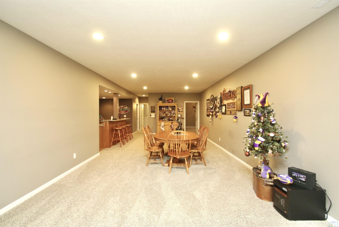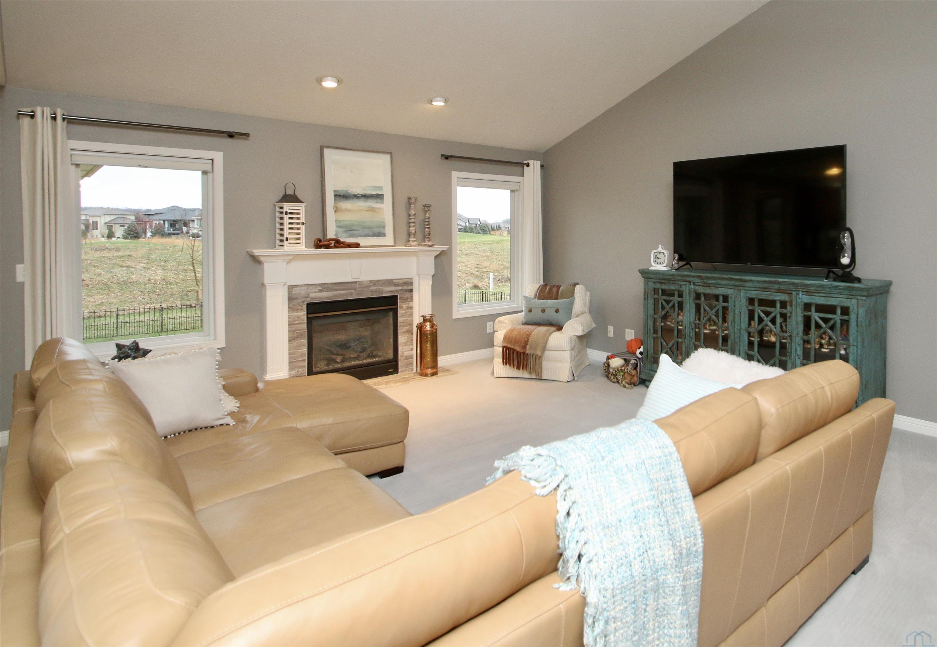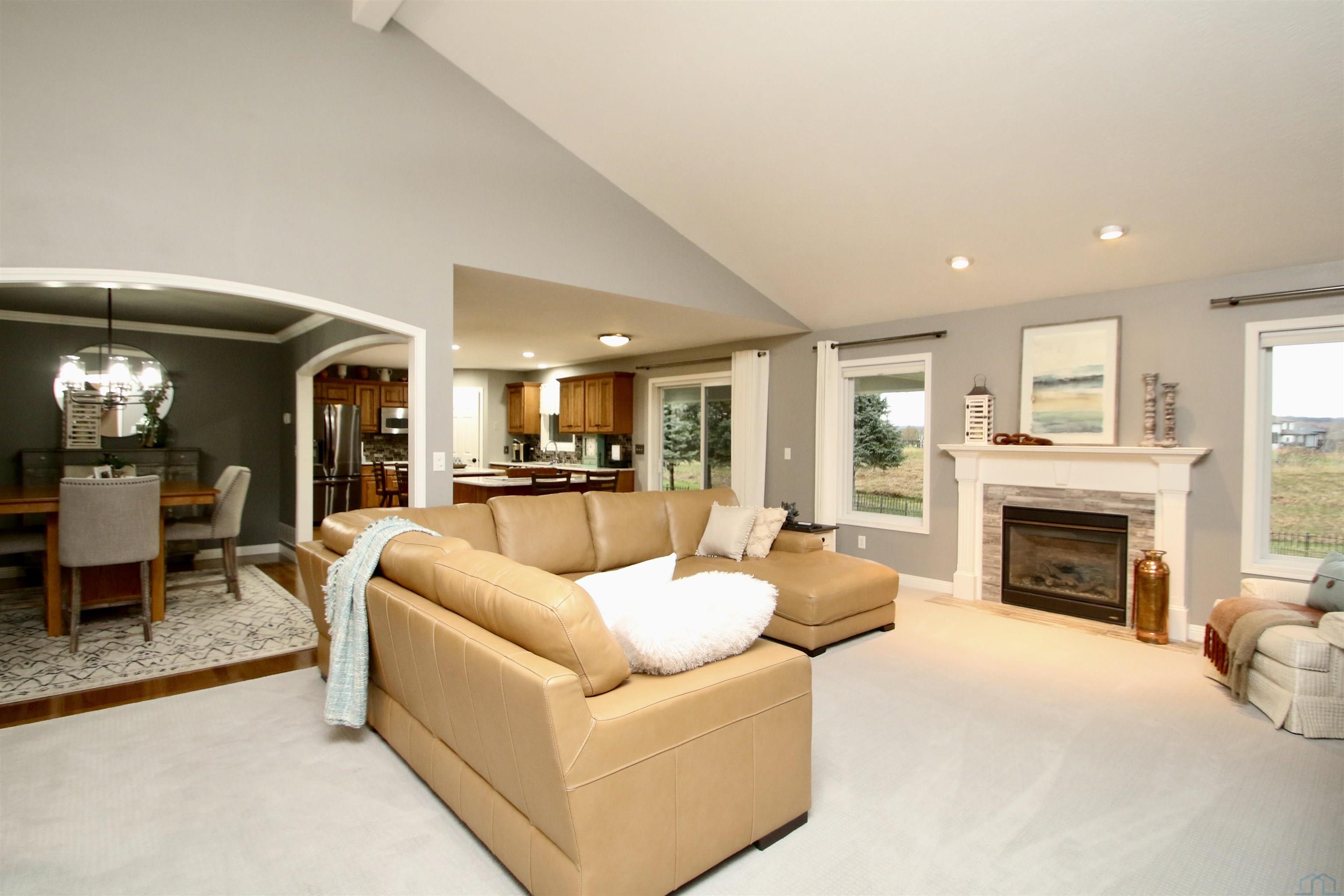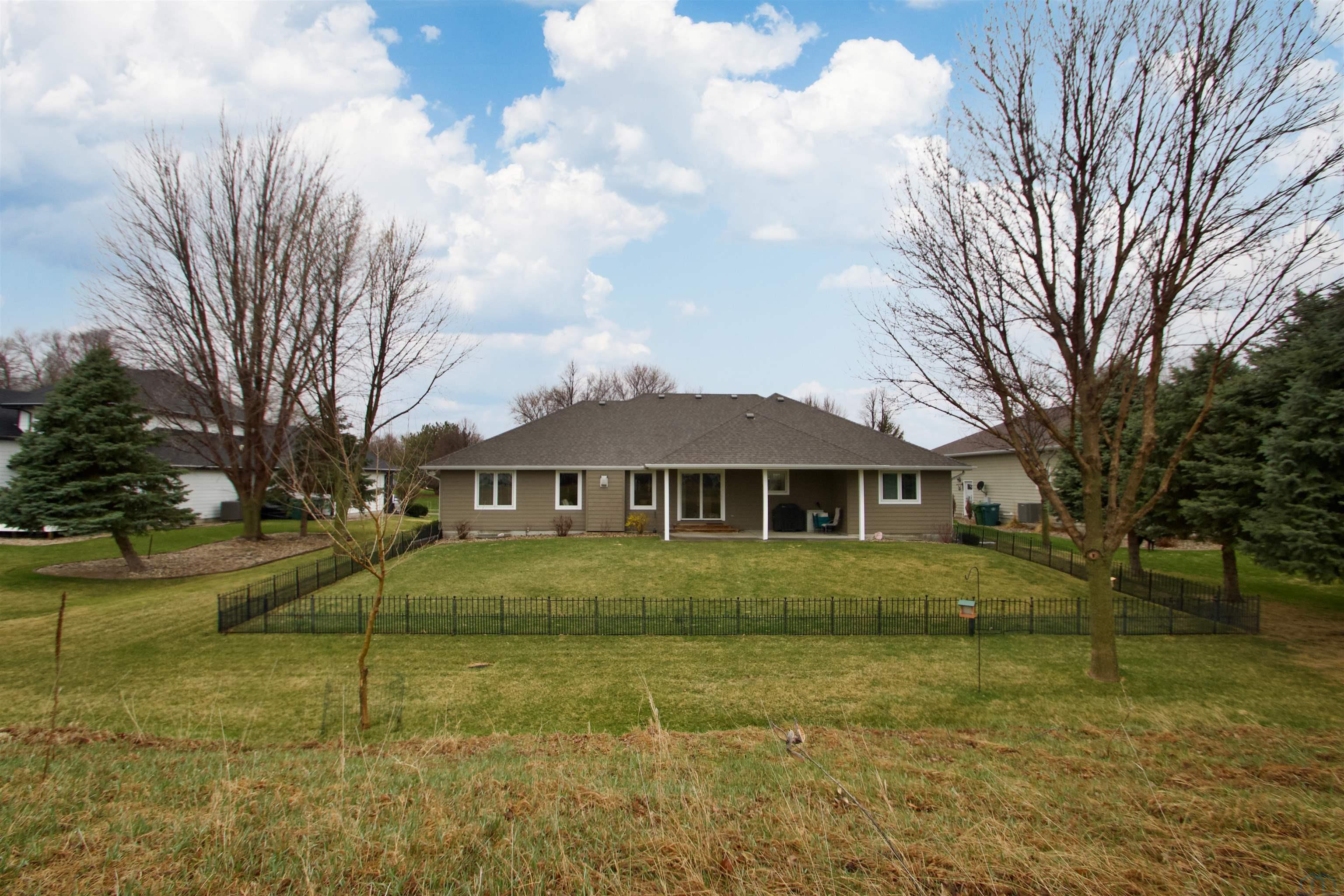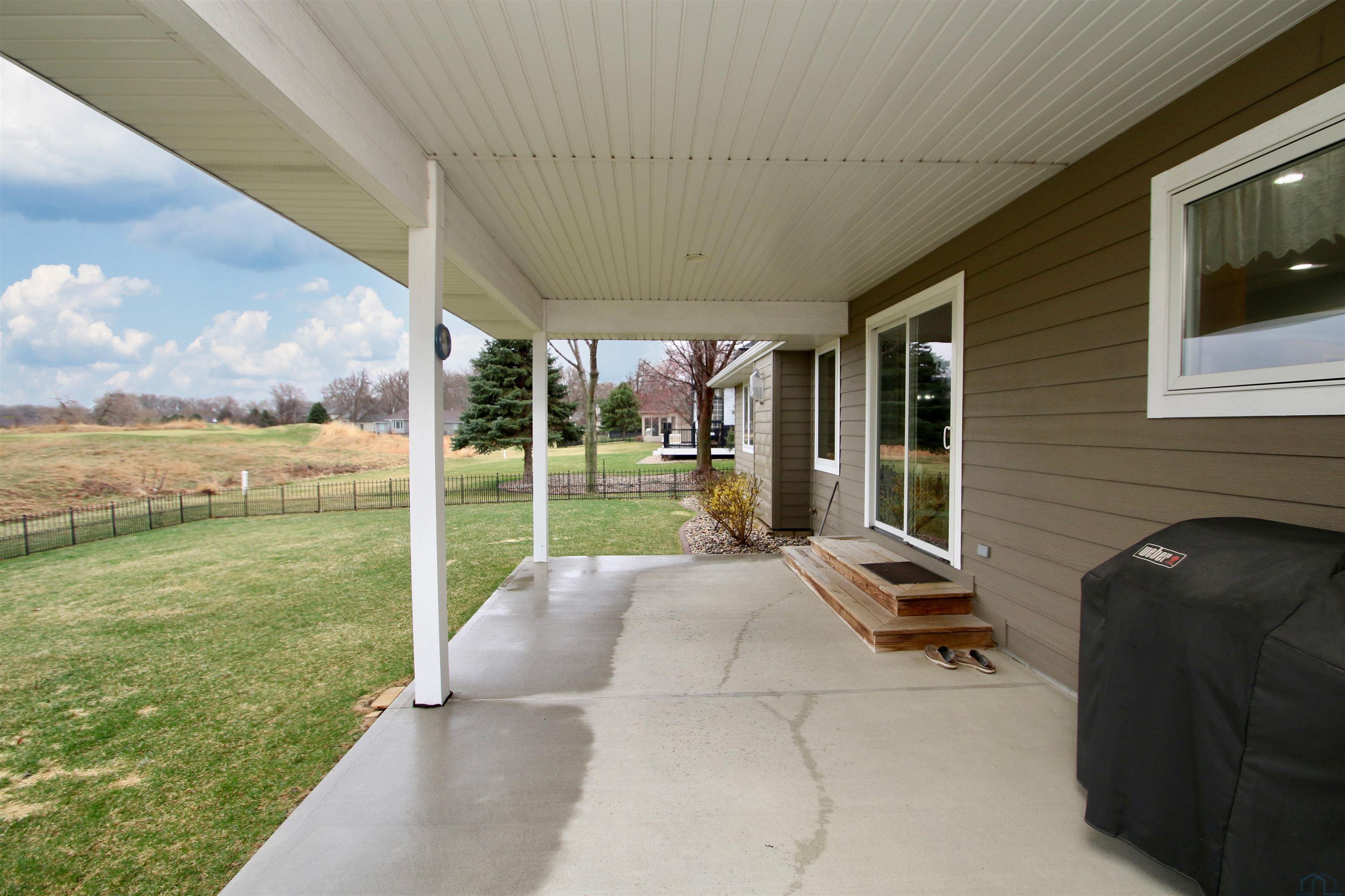 One-owner custom-built ranch with views of the #3 green at Dakota Dunes Golf Course, showcasing the exceptional care it has received since being built by Vondrak. This well-maintained home offers a unique and thoughtfully designed floor plan. The main floor features a private office with French doors and an accent wall, along with three bedrooms all with generous closets. The entryway, dining room, and kitchen are highlighted by real wood hickory flooring, complemented by hickory kitchen cabinets. The formal dining area, open to the kitchen, includes crown molding and an accent wall, creating a warm and inviting space for gatherings. The vaulted living room offers a comfortable setting with a gas fireplace and carpeted flooring. The kitchen provides generous cabinet space, a pantry, 2 islands with new quartz counters, double ovens and all appliances are included. A split bedroom layout adds functionality, with newer carpet in the bedrooms. The master bathroom features a jetted tub, nice sized walk in shower, double vanity, toilet room as well as a carpeted walk in closet. For guests there is a full bathroom with tub/shower combo and large single vanity. A laundry room completes the main floor. The finished lower level includes an expansive 14 x 49 space, ideal for a variety of uses, and was completed a couple of years after the home was built. This level also features a fourth bedroom, an additional den, wet bar, a ¾ bath and plenty of storage. The basement is a poured foundation. Recent updates include exterior painting in 2024, interior painting in 2023, new shingles and gutters in 2017, updated lower-level bathroom vanities in 2023, and a new AC unit in 2022. Off the kitchen, enjoy a covered 12 x 24 patio—an excellent space for outdoor entertaining. This is not your ordinary floor plan, offering both comfort and versatility.