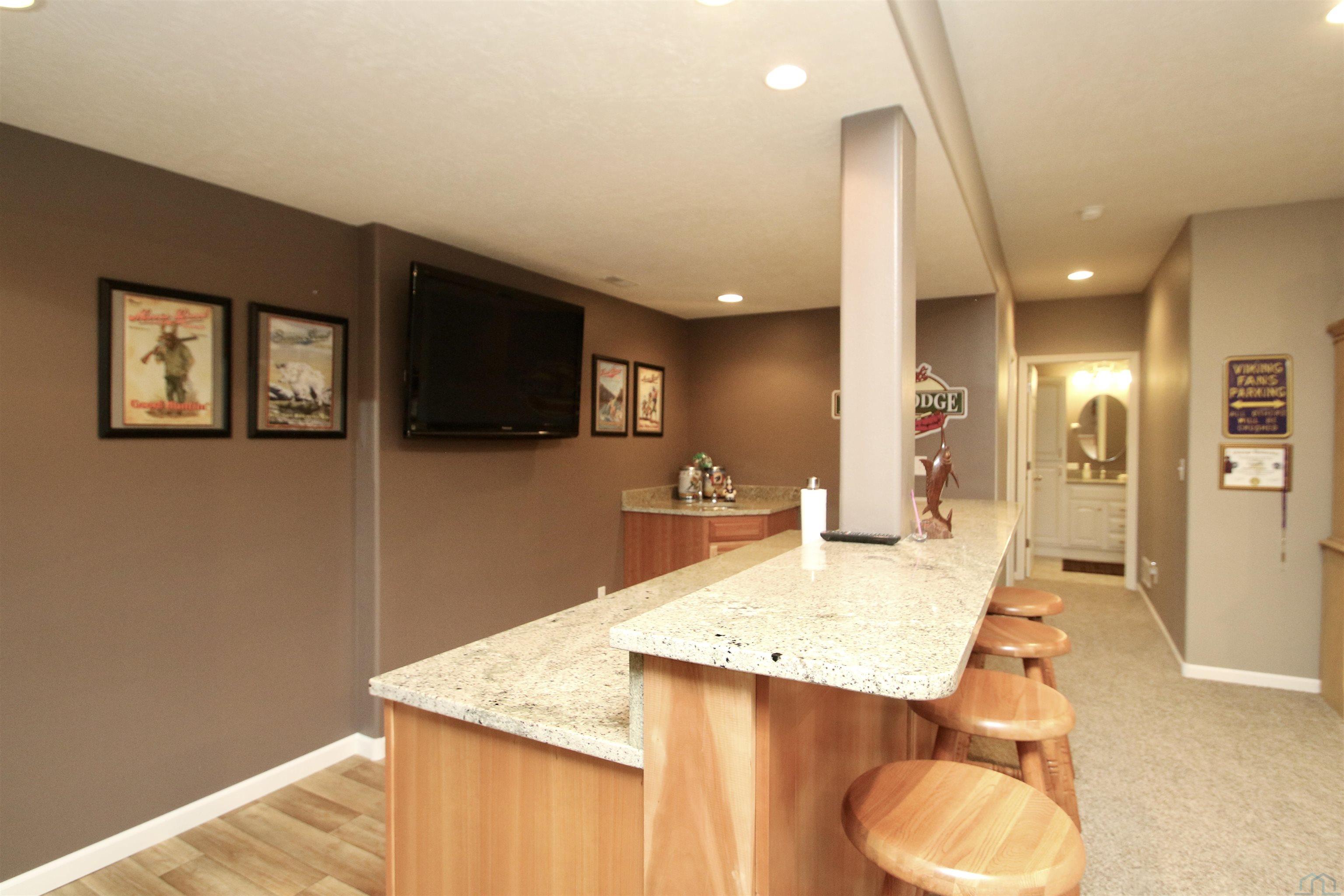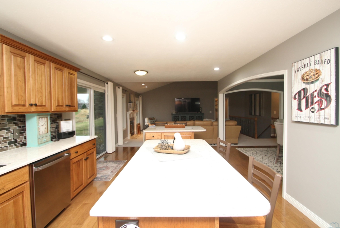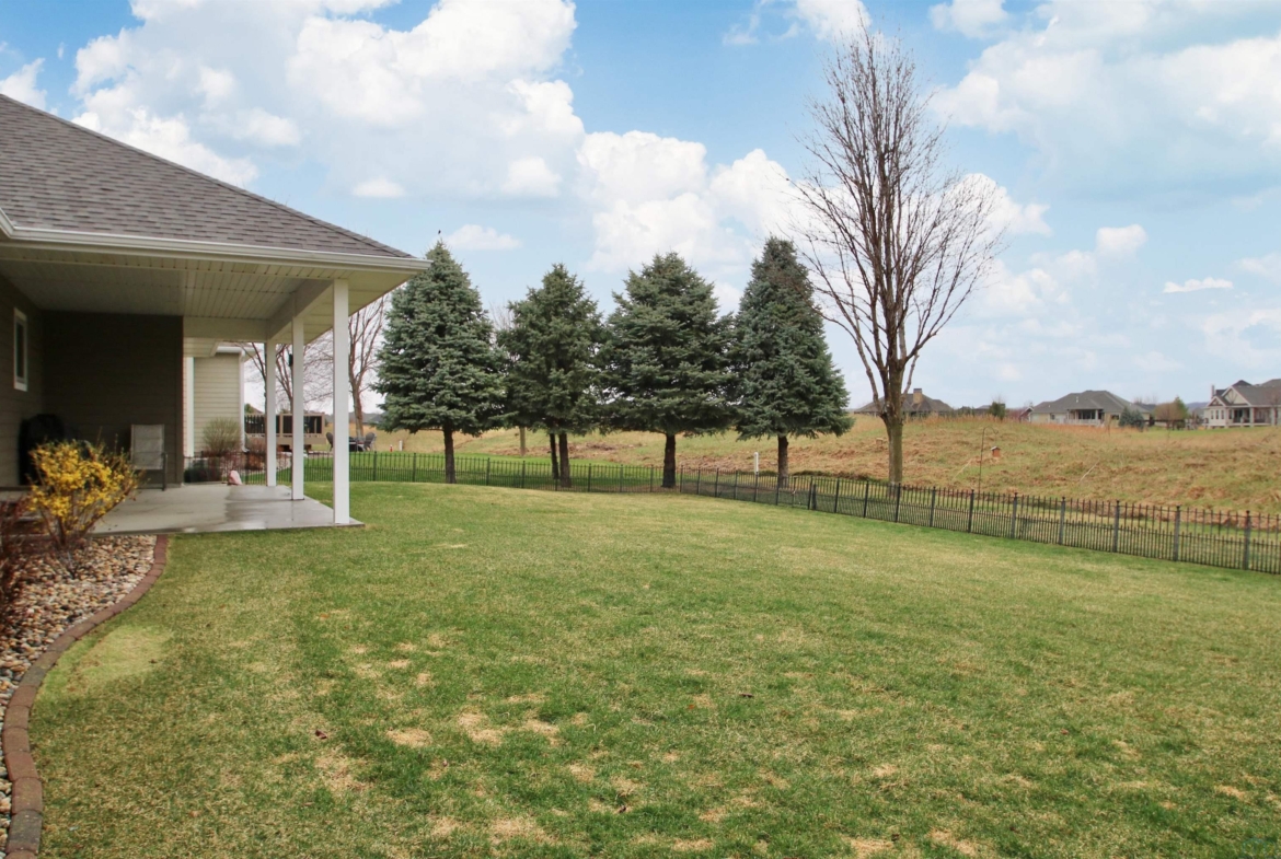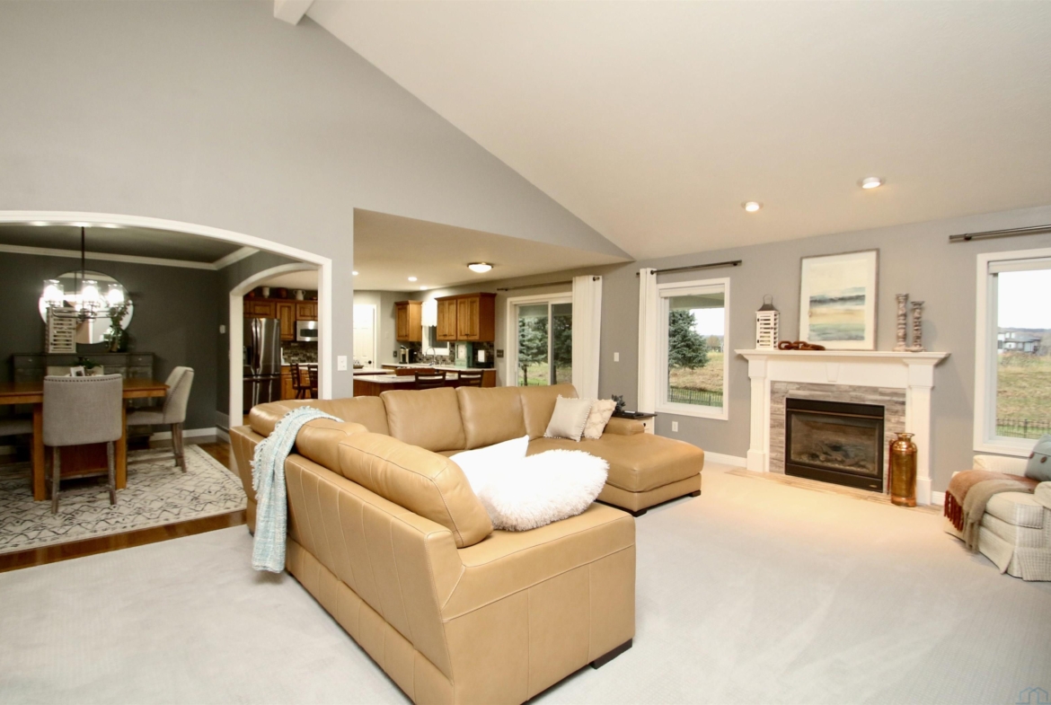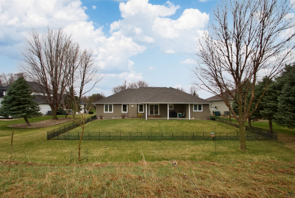 One-owner custom-built ranch with views of the #3 green at Dakota Dunes Golf Course, showcasing the exceptional care it has received since being built by Vondrak. This well-maintained home offers a unique and thoughtfully designed floor plan. The main floor features a private office with French doors and an accent wall, along with three bedrooms all with generous closets. The entryway, dining room, and kitchen are highlighted by real wood hickory flooring, complemented by hickory kitchen cabinets. The formal dining area, open to the kitchen, includes crown molding and an accent wall, creating a warm and inviting space for gatherings. The vaulted living room offers a comfortable setting with a gas fireplace and carpeted flooring. The kitchen provides generous cabinet space, a pantry, 2 islands with new quartz counters, double ovens and all appliances are included. A split bedroom layout adds functionality, with newer carpet in the bedrooms. The master bathroom features a jetted tub, nice sized walk in shower, double vanity, toilet room as well as a carpeted walk in closet. For guests there is a full bathroom with tub/shower combo and large single vanity. A laundry room completes the main floor. The finished lower level includes an expansive 14 x 49 space, ideal for a variety of uses, and was completed a couple of years after the home was built. This level also features a fourth bedroom, an additional den, wet bar, a ¾ bath and plenty of storage. The basement is a poured foundation. Recent updates include exterior painting in 2024, interior painting in 2023, new shingles and gutters in 2017, updated lower-level bathroom vanities in 2023, and a new AC unit in 2022. Off the kitchen, enjoy a covered 12 x 24 patio—an excellent space for outdoor entertaining. This is not your ordinary floor plan, offering both comfort and versatility.
