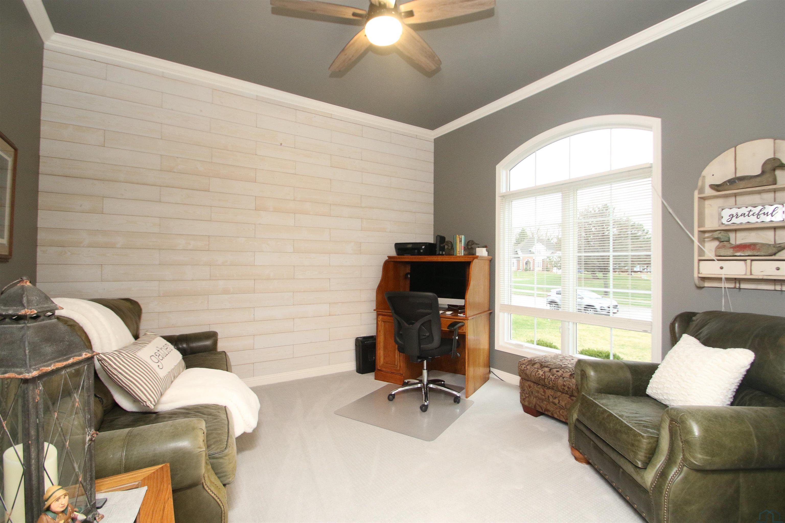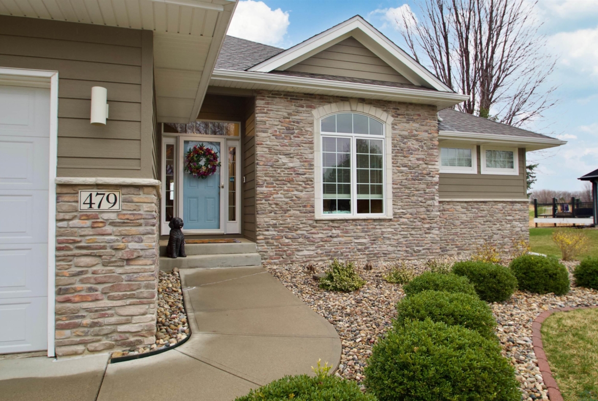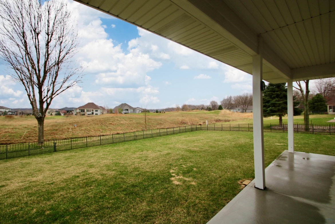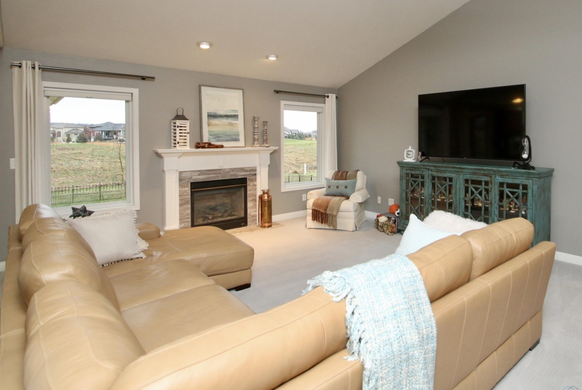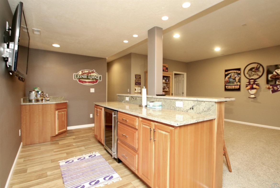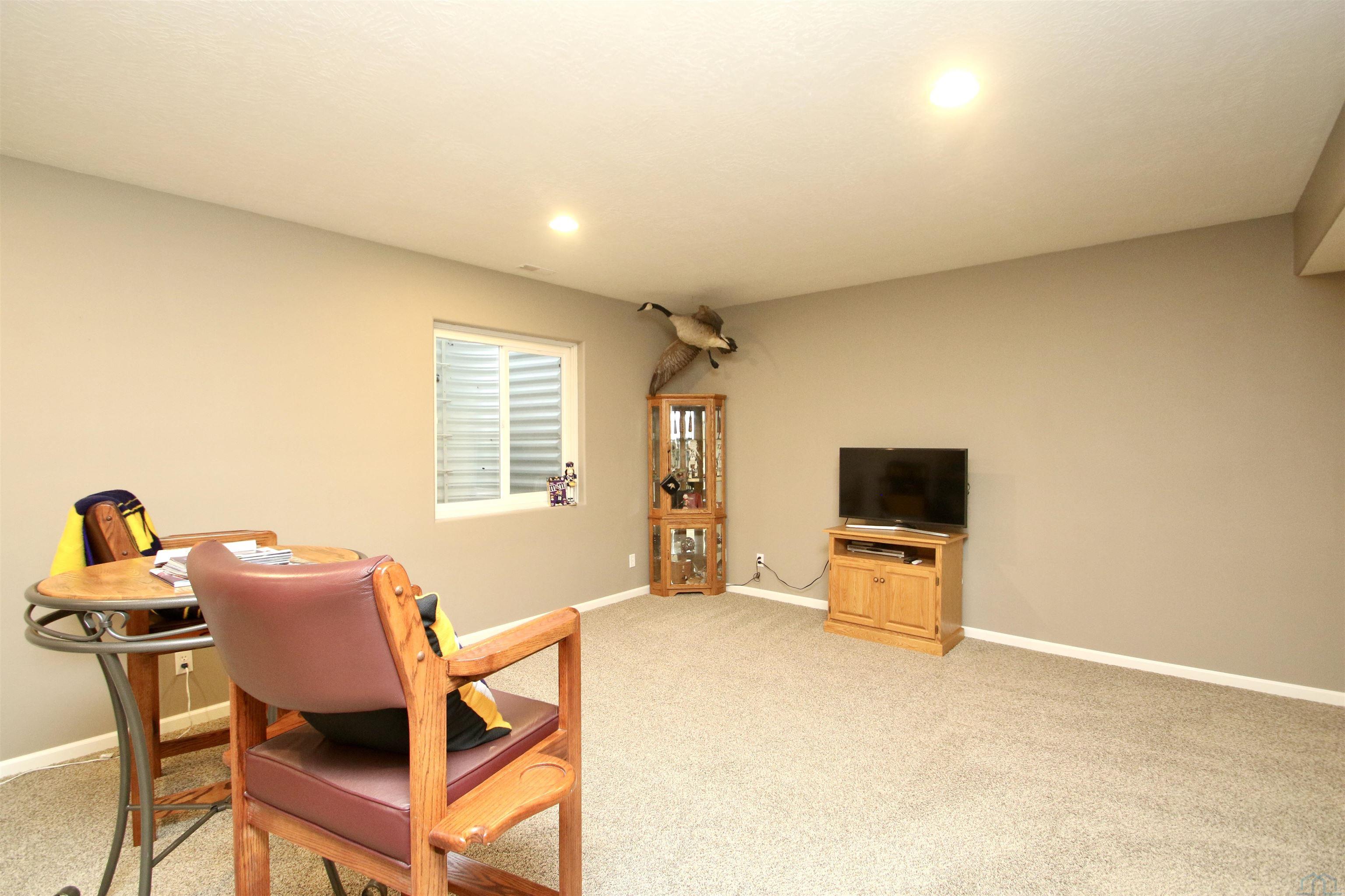 One-owner custom-built ranch with views of the #3 green at Dakota Dunes Golf Course, showcasing the exceptional care it has received since being built by Vondrak. This well-maintained home offers a unique and thoughtfully designed floor plan. The main floor features a private office with French doors and an accent wall, along with three bedrooms all with generous closets. The entryway, dining room, and kitchen are highlighted by real wood hickory flooring, complemented by hickory kitchen cabinets. The formal dining area, open to the kitchen, includes crown molding and an accent wall, creating a warm and inviting space for gatherings. The vaulted living room offers a comfortable setting with a gas fireplace and carpeted flooring. The kitchen provides generous cabinet space, a pantry, 2 islands with new quartz counters, double ovens and all appliances are included. A split bedroom layout adds functionality, with newer carpet in the bedrooms. The master bathroom features a jetted tub, nice sized walk in shower, double vanity, toilet room as well as a carpeted walk in closet. For guests there is a full bathroom with tub/shower combo and large single vanity. A laundry room completes the main floor. The finished lower level includes an expansive 14 x 49 space, ideal for a variety of uses, and was completed a couple of years after the home was built. This level also features a fourth bedroom, an additional den, wet bar, a ¾ bath and plenty of storage. The basement is a poured foundation. Recent updates include exterior painting in 2024, interior painting in 2023, new shingles and gutters in 2017, updated lower-level bathroom vanities in 2023, and a new AC unit in 2022. Off the kitchen, enjoy a covered 12 x 24 patio—an excellent space for outdoor entertaining. This is not your ordinary floor plan, offering both comfort and versatility.