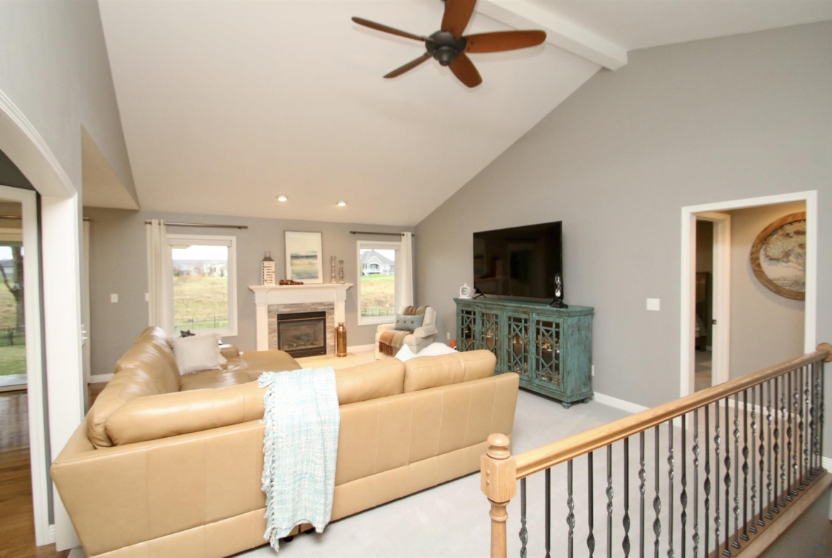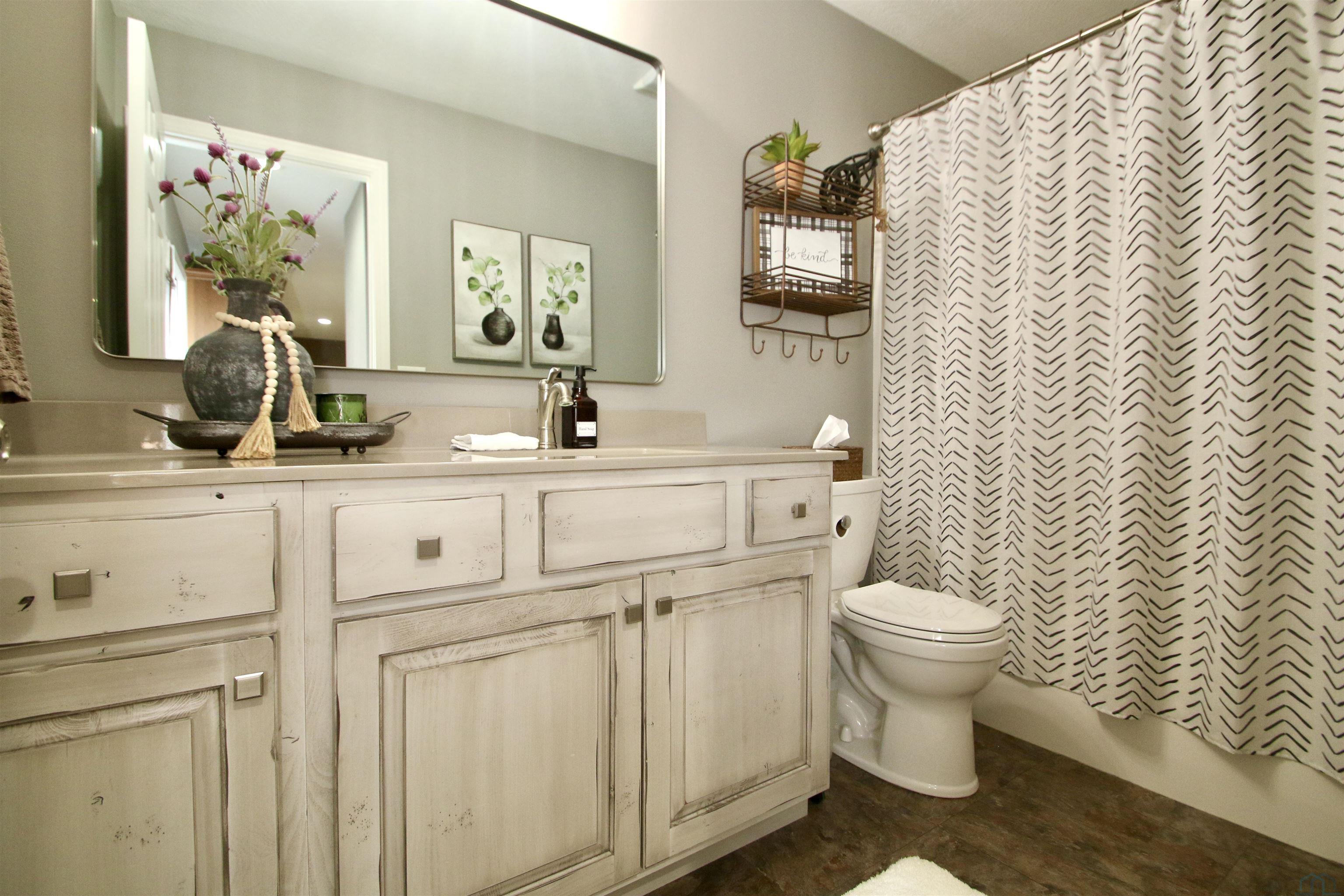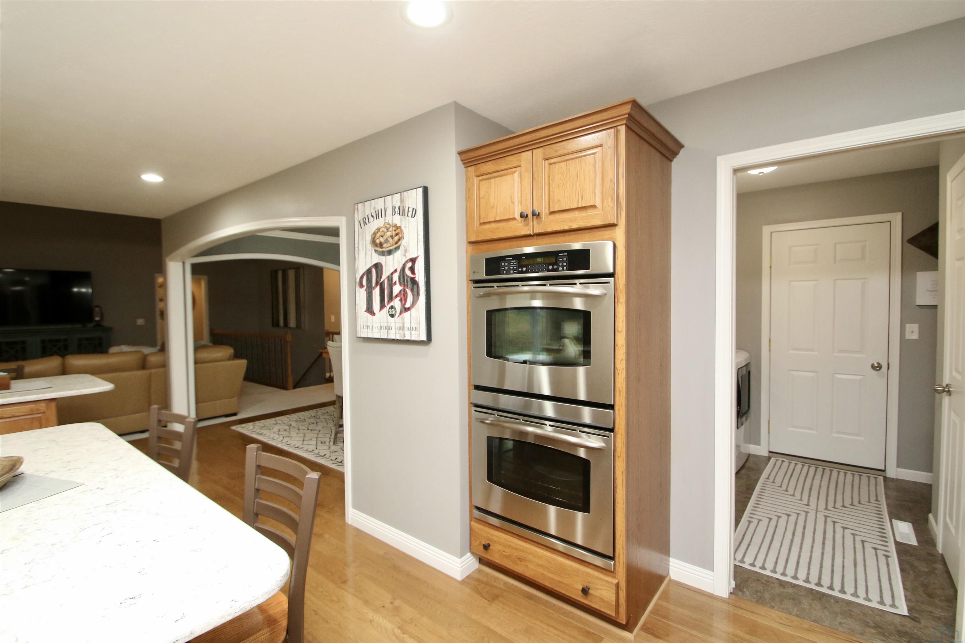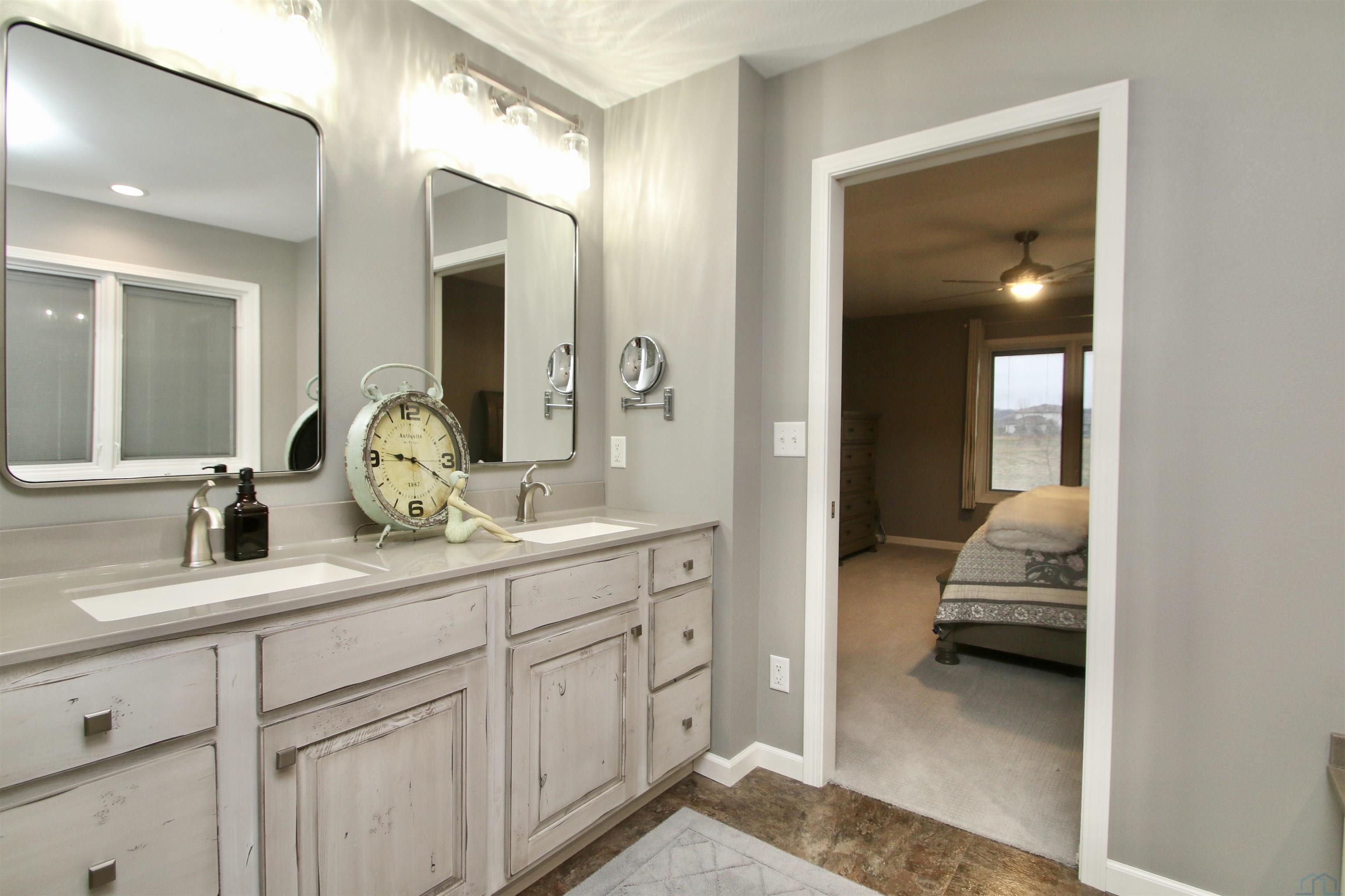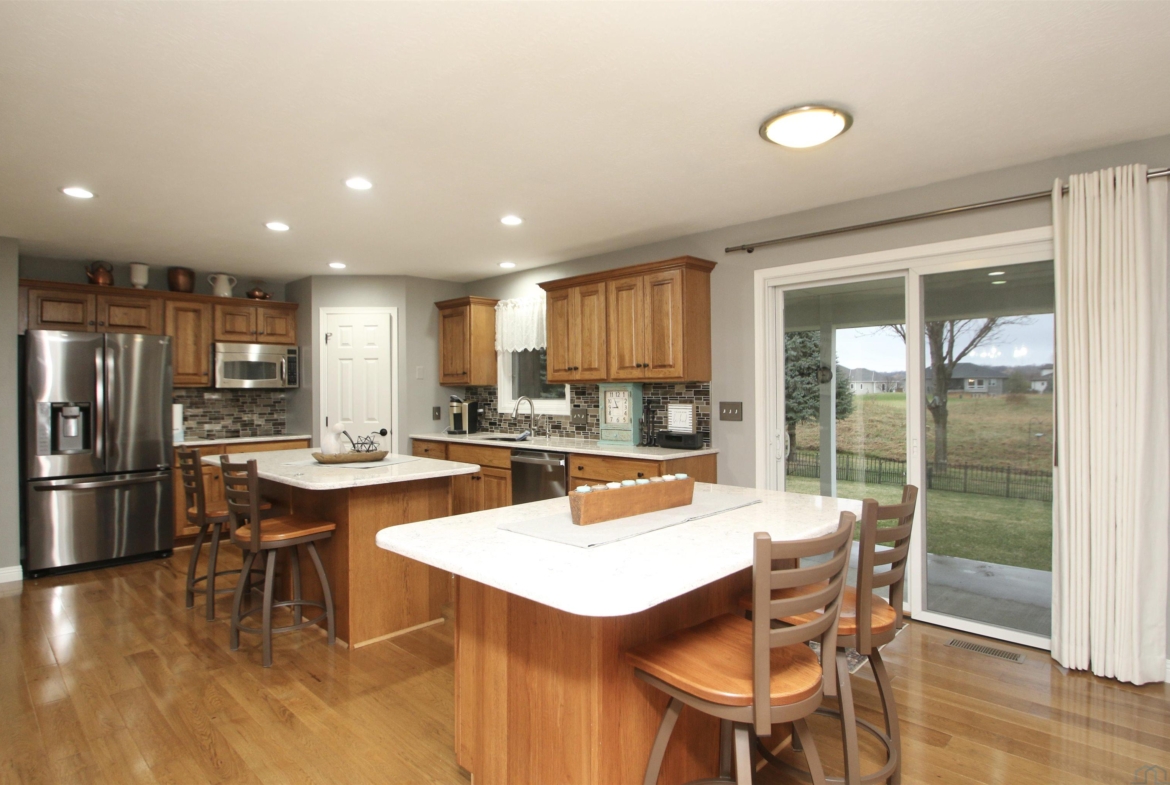 One-owner custom-built ranch with views of the #3 green at Dakota Dunes Golf Course, showcasing the exceptional care it has received since being built by Vondrak. This well-maintained home offers a unique and thoughtfully designed floor plan. The main floor features a private office with French doors and an accent wall, along with three bedrooms all with generous closets. The entryway, dining room, and kitchen are highlighted by real wood hickory flooring, complemented by hickory kitchen cabinets. The formal dining area, open to the kitchen, includes crown molding and an accent wall, creating a warm and inviting space for gatherings. The vaulted living room offers a comfortable setting with a gas fireplace and carpeted flooring. The kitchen provides generous cabinet space, a pantry, 2 islands with new quartz counters, double ovens and all appliances are included. A split bedroom layout adds functionality, with newer carpet in the bedrooms. The master bathroom features a jetted tub, nice sized walk in shower, double vanity, toilet room as well as a carpeted walk in closet. For guests there is a full bathroom with tub/shower combo and large single vanity. A laundry room completes the main floor. The finished lower level includes an expansive 14 x 49 space, ideal for a variety of uses, and was completed a couple of years after the home was built. This level also features a fourth bedroom, an additional den, wet bar, a ¾ bath and plenty of storage. The basement is a poured foundation. Recent updates include exterior painting in 2024, interior painting in 2023, new shingles and gutters in 2017, updated lower-level bathroom vanities in 2023, and a new AC unit in 2022. Off the kitchen, enjoy a covered 12 x 24 patio—an excellent space for outdoor entertaining. This is not your ordinary floor plan, offering both comfort and versatility.