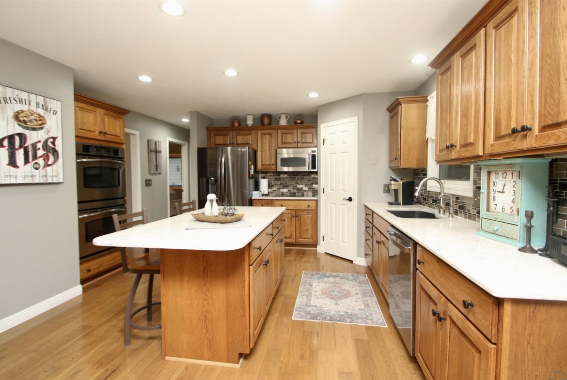 | Kitchen | Main | 12 x 23 + 3x4 pantry | Hickory floors and cabinets, 2 islands, dbl oven SS app. |