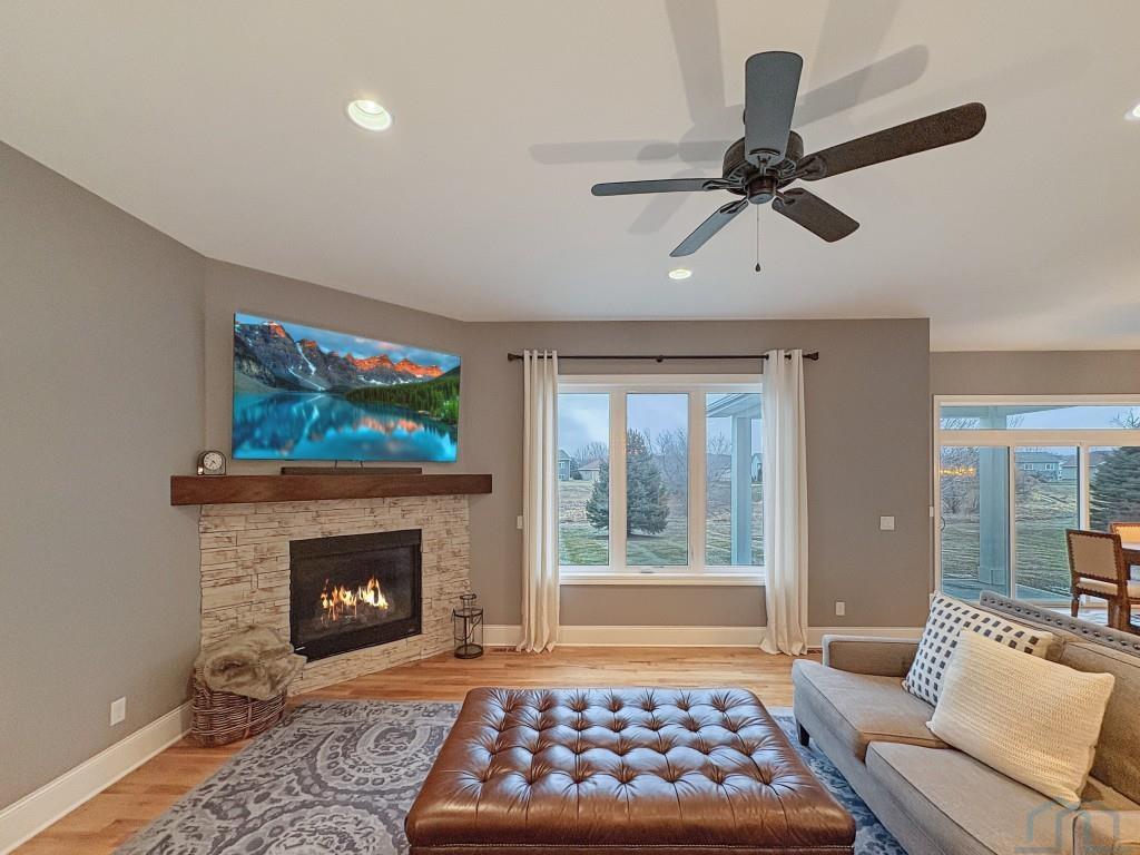 This is a meticulously cared-for one owner property. Built by Kelly Construction, this ranch home has 2070 sq ft on the main level and a beautifully finished basement. Hardwood floors give you a warm welcome into the home. Open concept floorplan that works well for nearly everyone! The hardwood floors continue through the living room, kitchen and dining spaces. A beautiful gas fireplace is situated in the living room corner. The kitchen has gorgeous quartz countertops, an island for easy prep and barstool seating, stainless steel appliances, including a gas cooktop, are all included with the home. The dining space is open to the kitchen and has a sliding door access to the covered patio. The primary suite is nicely sized, coffered ceiling, windows to the backyard. A beautiful primary bathroom offers 2 sinks for easy morning schedules, heated tile floor, a tile walk in shower plus a large 5×12 walk in closet with SOS organizers. Down the hallway, there are 2 more bedrooms plus a full bath in the hallway with great tilework. The laundry room is on main with a utility sink, several cabinets and a closet. Washer and Dryer are included. Great use of space for storing items. In the lower level, you will find a wide open family room with a 2nd gas fireplace and linear wet bar. Perfect for game day or holiday gatherings! The basement has barely been used and shows that way! Bedrooms 4 and 5 are both nice sized bedrooms; bedroom 5 has a larger than expected WIC. There is a hallway bath with a tub/shower in the lower level as well. The plan allows for generous storage plus plenty of room for a work out area, if desired. Triple car garage. New roof in 2018. Flat yard with sprinklers. Gas line to the patio for your grill. Beautiful landscape with curbing. No detail was overlooked for this property. Take a look for yourself!