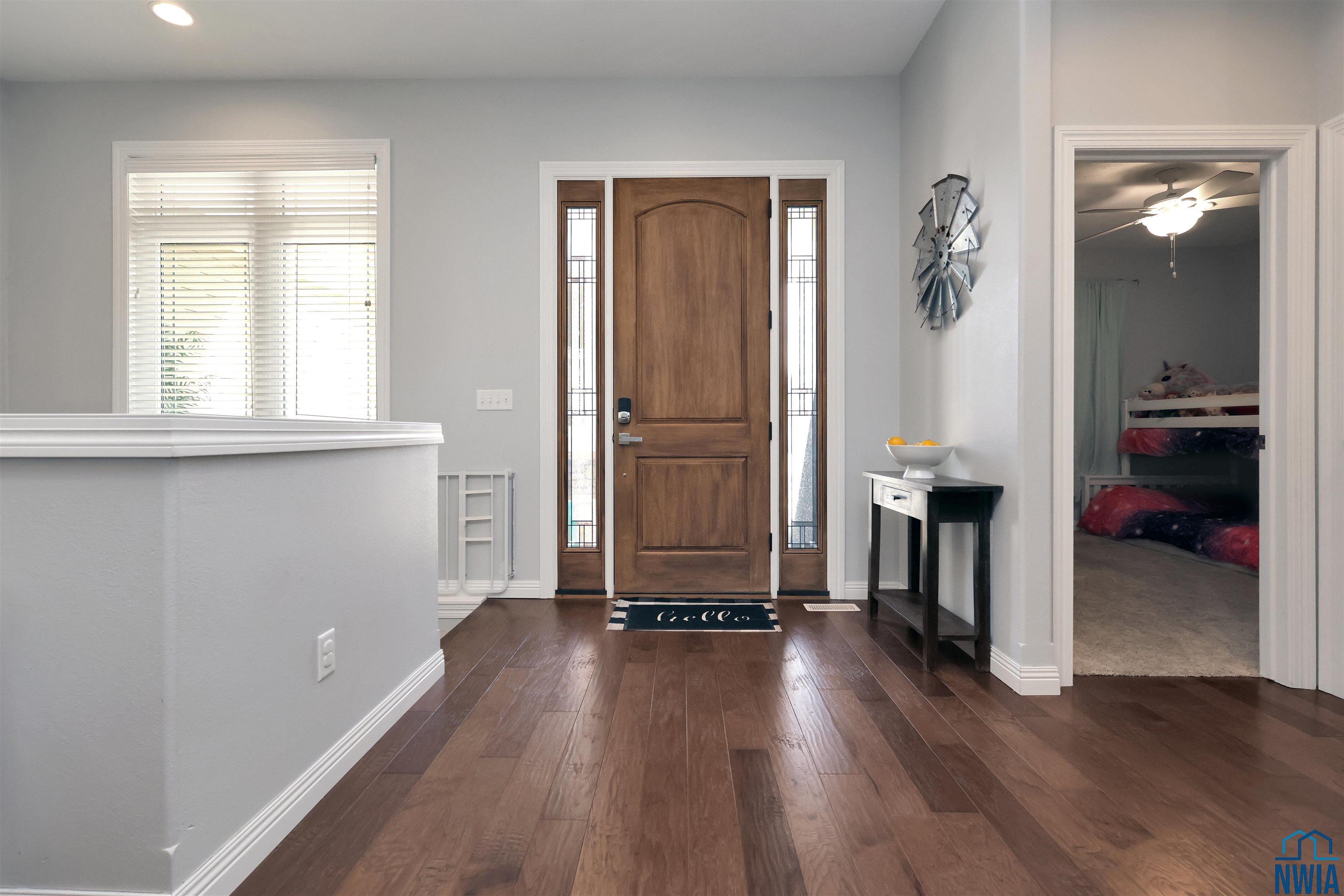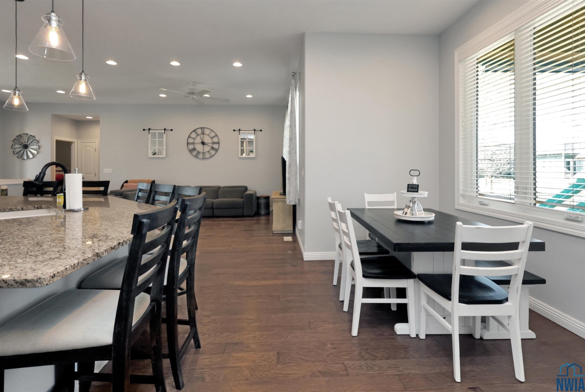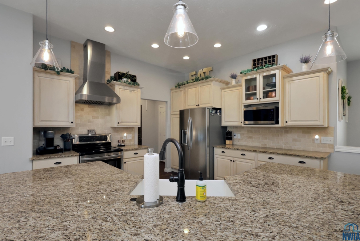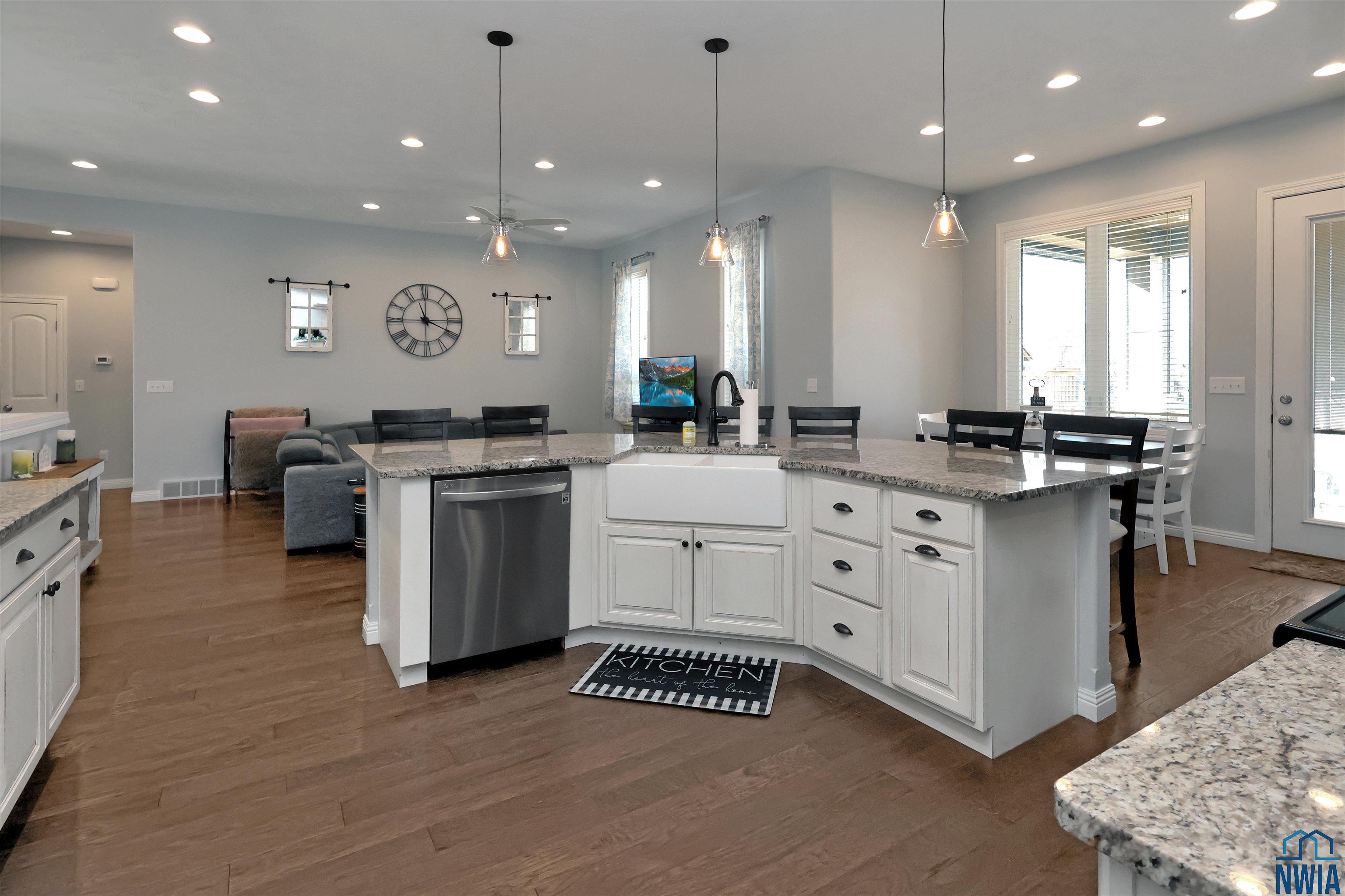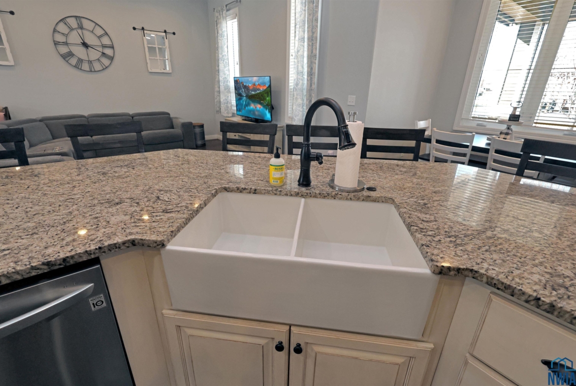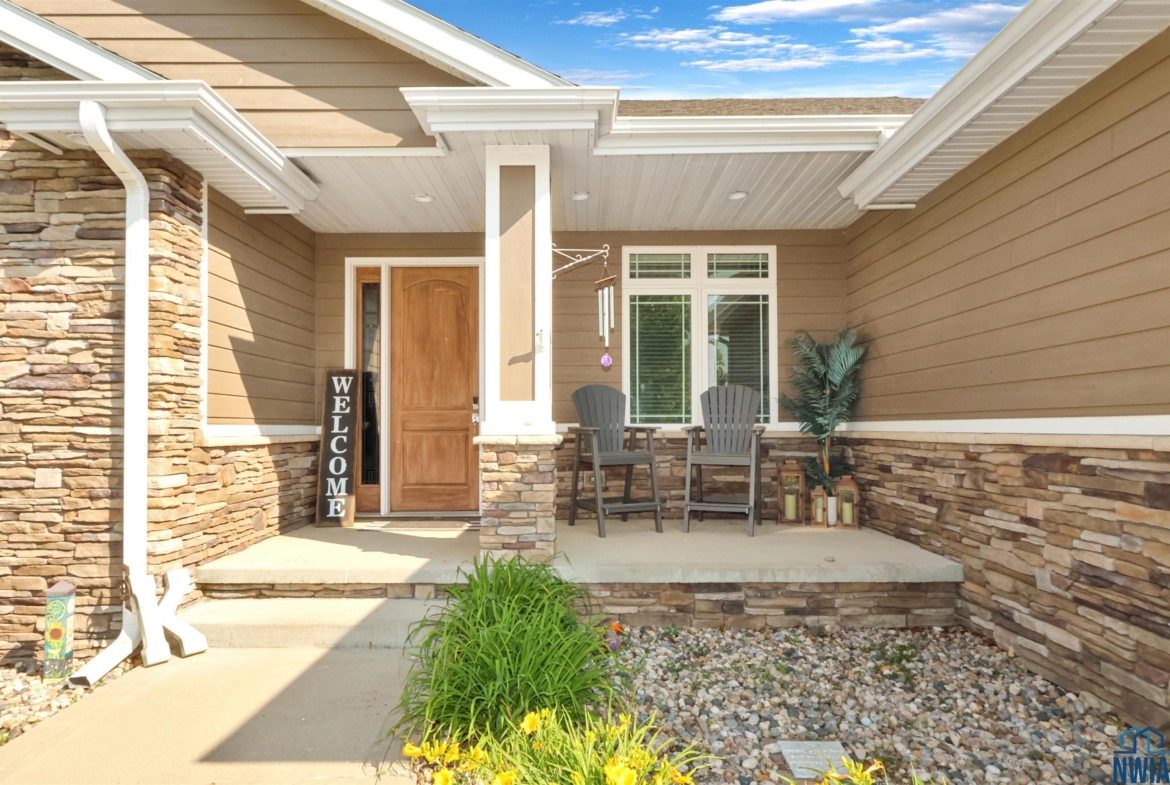 Come home to 573 Sandstone Circle, a 5 bed, 3 bath ranch on one of the most coveted neighborly streets in Dakota Dunes. The home is in The Meadows on a cul-de-sac that is all about community: holiday and birthday gatherings, evening get togethers, and all the action of neighbors who are like family. When you arrive you will appreciate striking curb appeal and a covered front porch. Once inside a spacious foyer greets, and the open-concept living space is cohesive thanks to the living room’s recently added and perfectly matched hardwoods that now span the entire space. The kitchen was made for entertaining or enjoying meals at home, with granite counters, oversized island, tasteful cabinets, backsplash, and stainless appliances. Off the kitchen is the drop zone with recently added lockers + laundry area. Behind the laundry to the back of the home is the spacious primary en suite, with tray ceiling, upgraded 5-piece bathroom with glass/tile shower, soak tub, dual sink vanity, + plenty of storage; the walk-in closet is well-designed. On the other side of the home are the two commodious spare bedrooms, both with great closets, and the main, full bath. In the basement is a large family room complete with gas fireplace, builtins, and brand new bar space with beautiful quartz countertops, builtin display shelving, & black stainless fridge. Space abounds here in this lower level with ample storage areas, concrete safe room, built-in play space under the stairs, two spare bedrooms, and another full bath. This property just has had permanent holiday lighting installed, offers recently shampooed carpets, fresh paint, 2 new water heaters (both 50-gal), heated/oversized 3-stall garage with built ins, fenced yard, covered patio, negotiable play set, and the benefit of close proximity to the Meadows park & the Country Club. Don’t let this beauty get away.