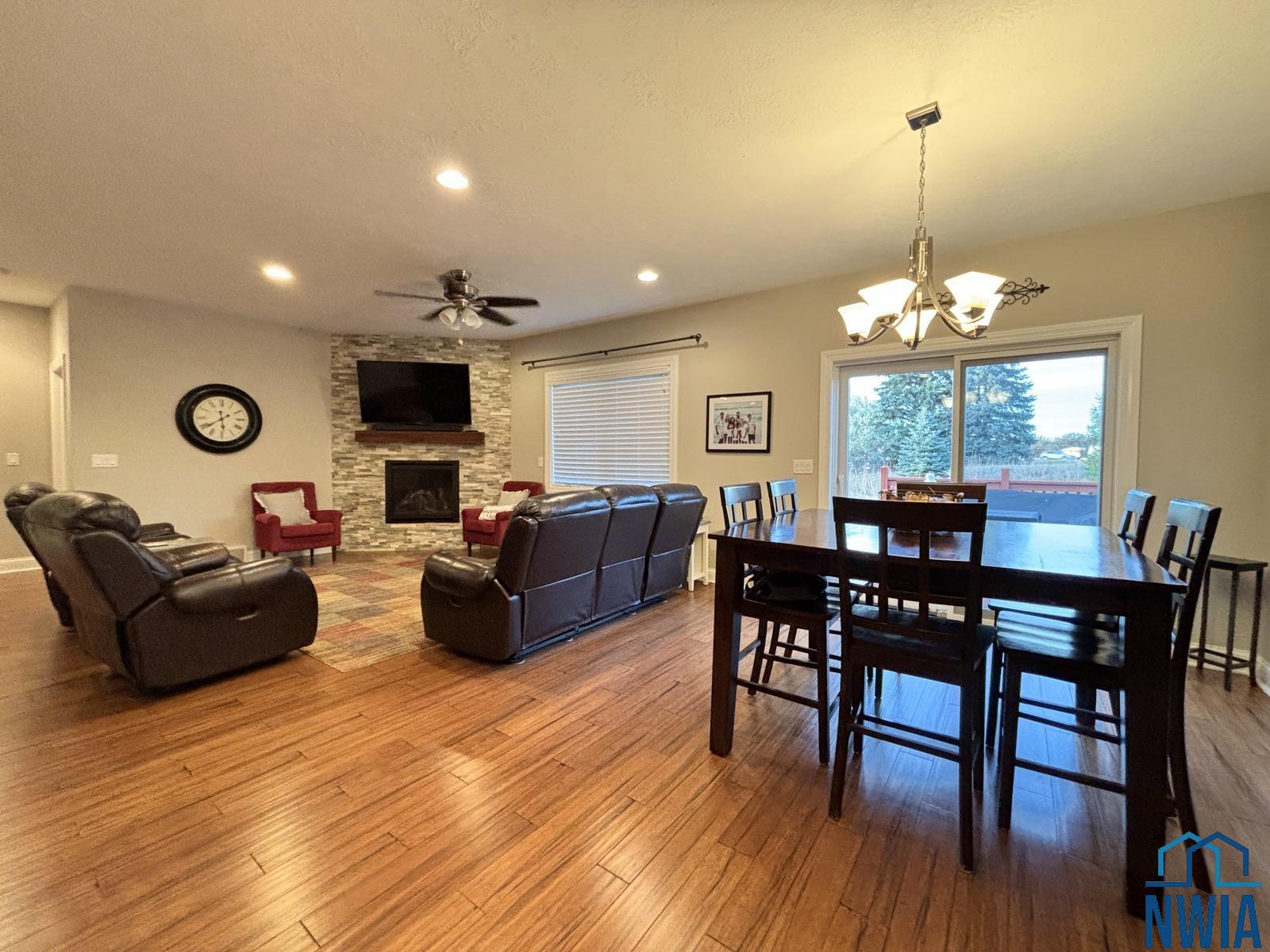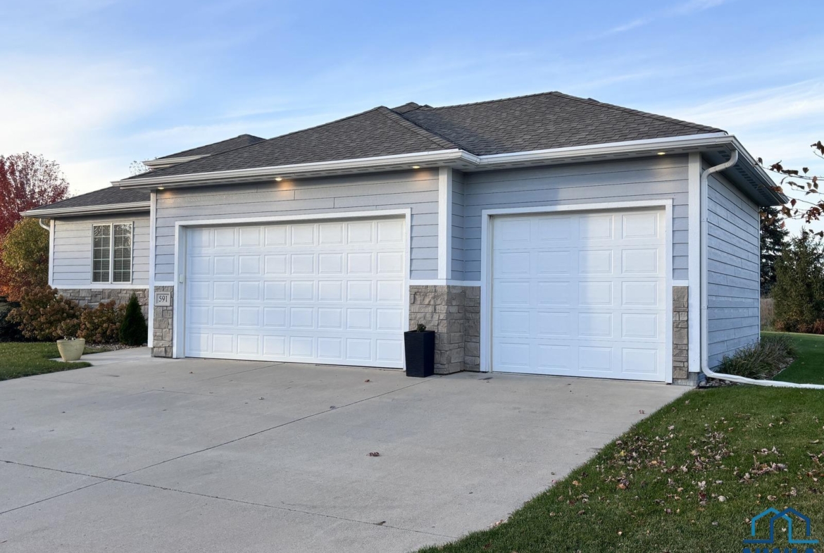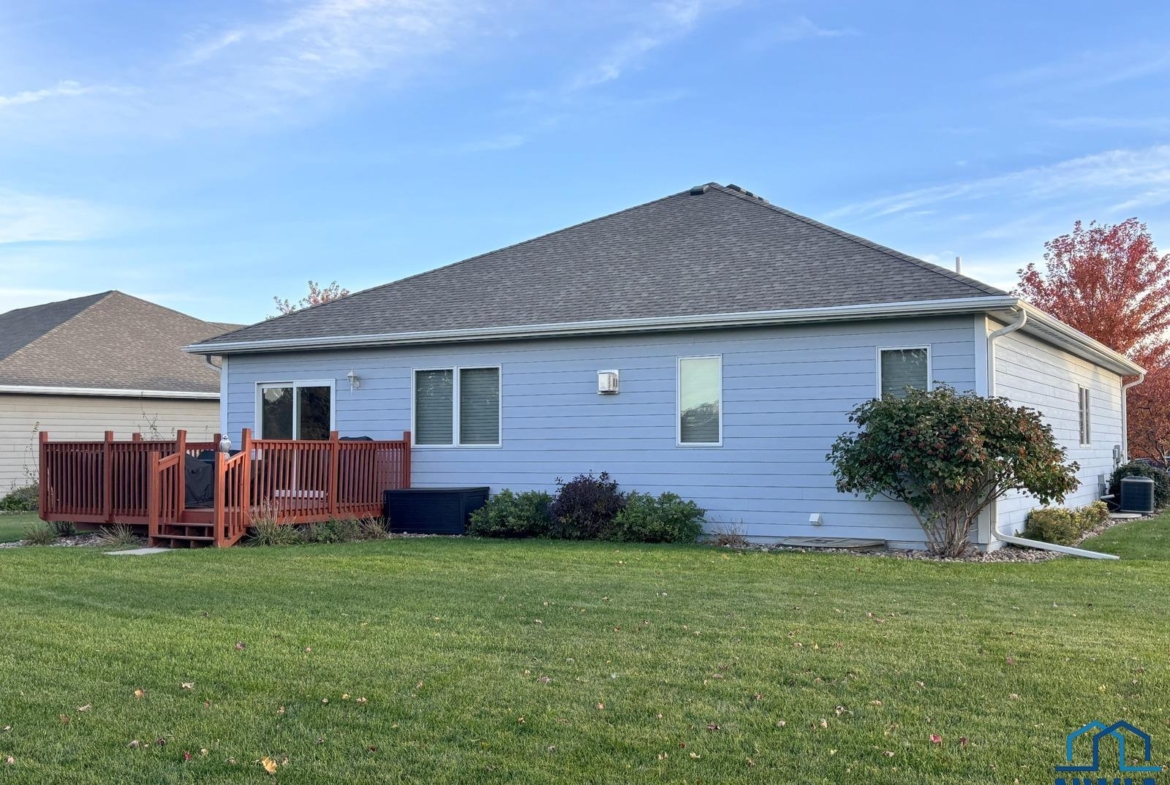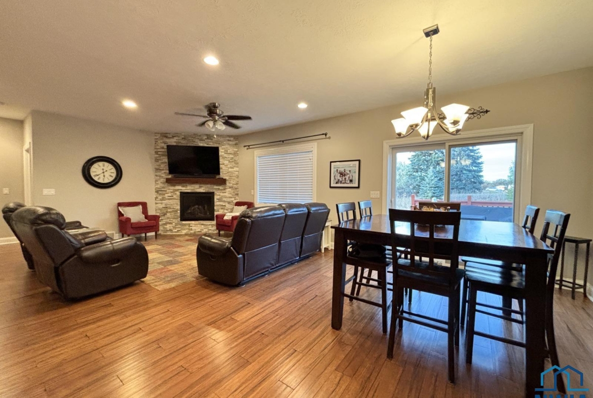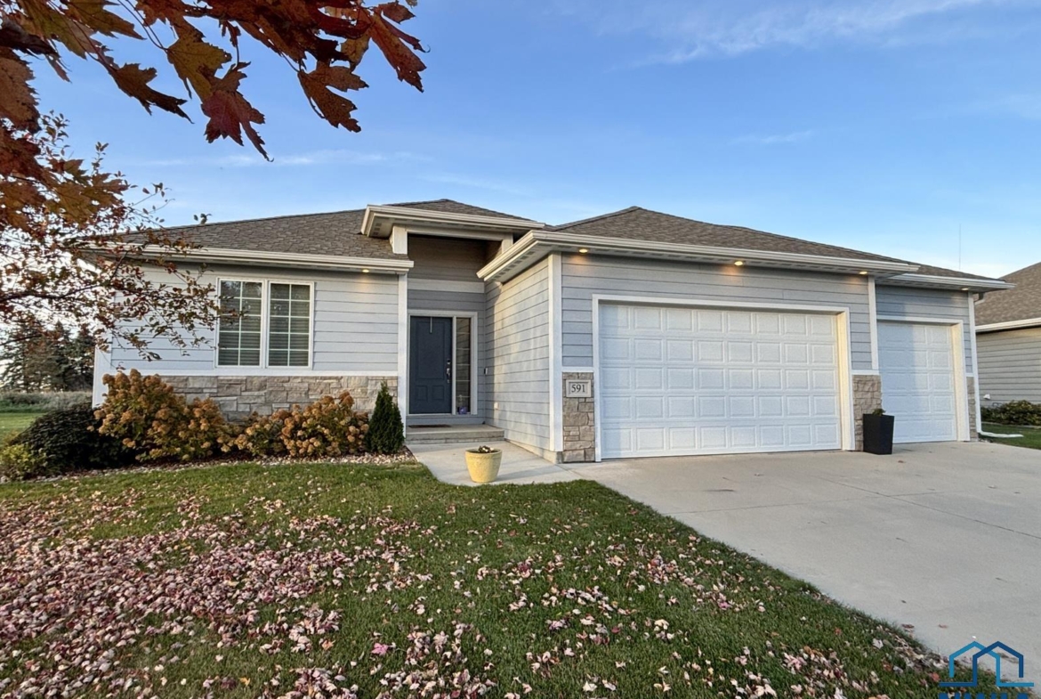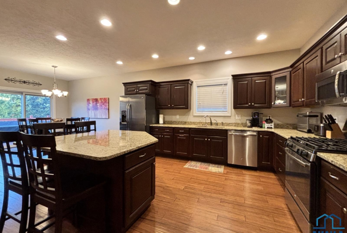 Very well maintained 5 bed, 3 bath ranch in the Prairie neighborhood of Dakota Dunes. Open concept floor plan with foyer leading to large kitchen, dining and living area, all with engineered hand-scraped wood flooring. Stainless appliances including gas range, granite countertops, island with breakfast bar and large pantry. Generous master suite with walk in closet, 2 additional bedrooms and full bath on main as well as main floor laundry room. Large, open family room down plus two more bedrooms, full bath and large storage room with built in shelving. All closets have organizers. Kitchen appliances, water softener and window treatments are included. Tankless water heater installed, 2024. Great location just minutes from major amenities and GREAT value for a 5 bed home!
