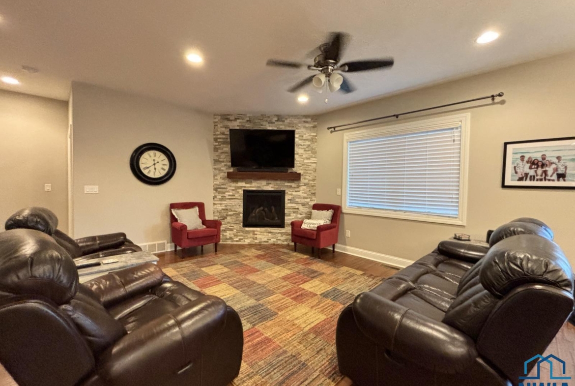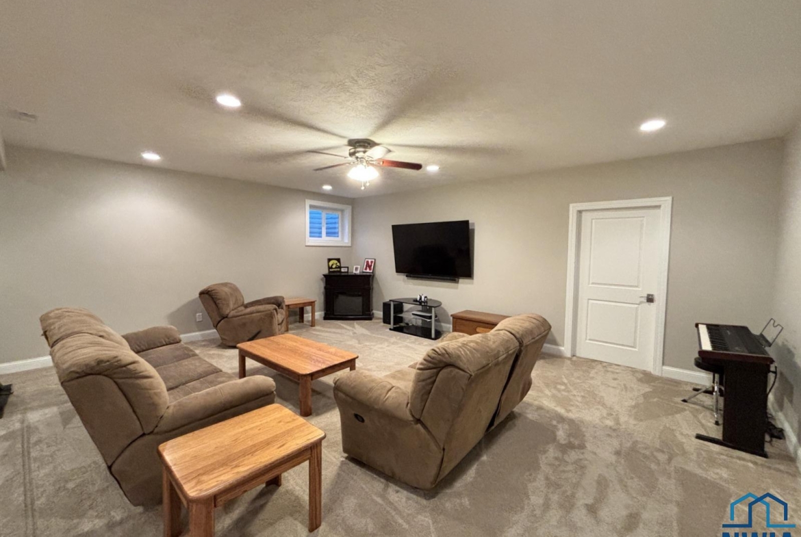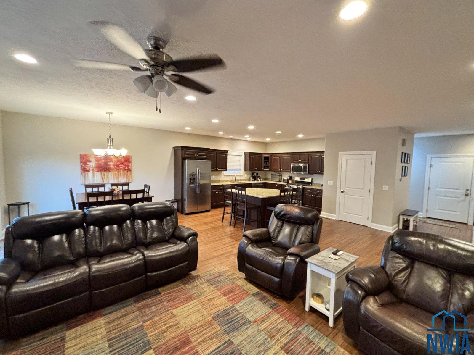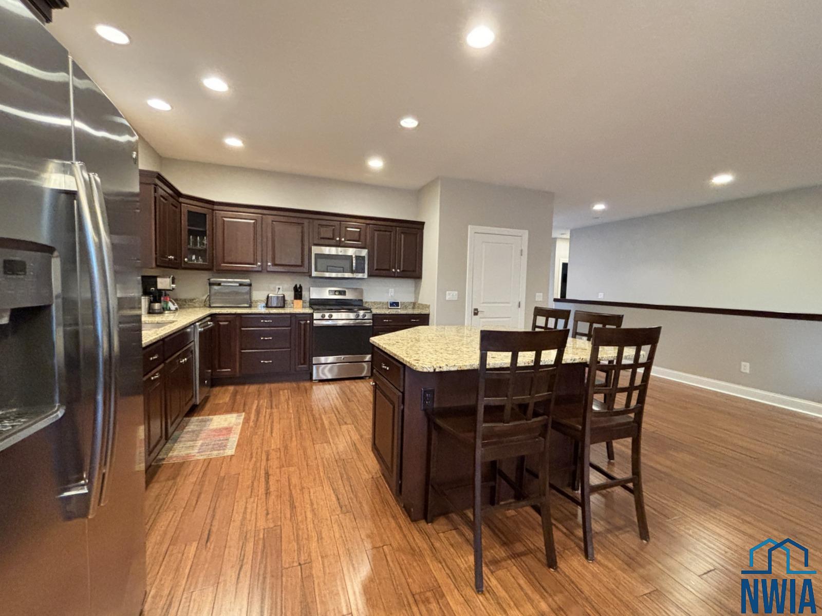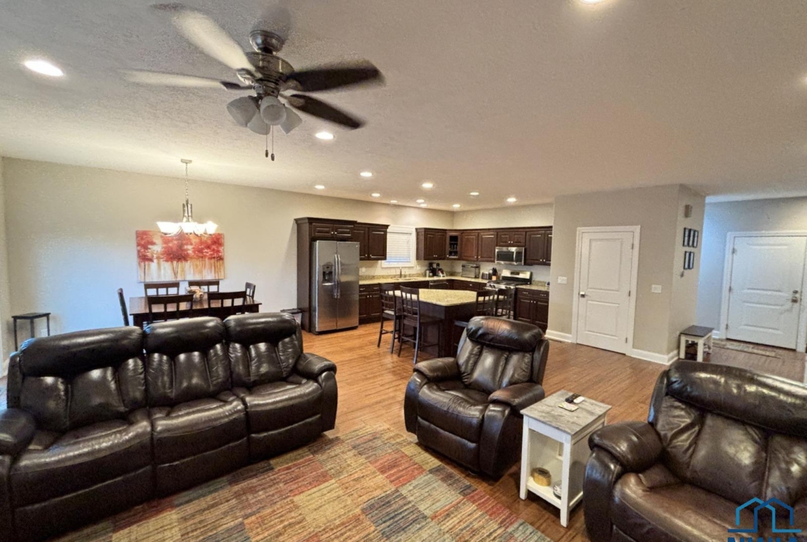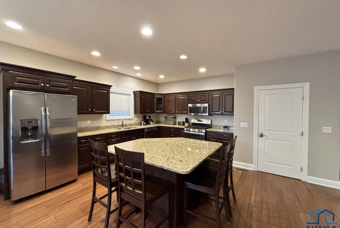 Very well maintained 5 bed, 3 bath ranch in the Prairie neighborhood of Dakota Dunes. Open concept floor plan with foyer leading to large kitchen, dining and living area, all with engineered hand-scraped wood flooring. Stainless appliances including gas range, granite countertops, island with breakfast bar and large pantry. Generous master suite with walk in closet, 2 additional bedrooms and full bath on main as well as main floor laundry room. Large, open family room down plus two more bedrooms, full bath and large storage room with built in shelving. All closets have organizers. Kitchen appliances, water softener and window treatments are included. Tankless water heater installed, 2024. Great location just minutes from major amenities and GREAT value for a 5 bed home!