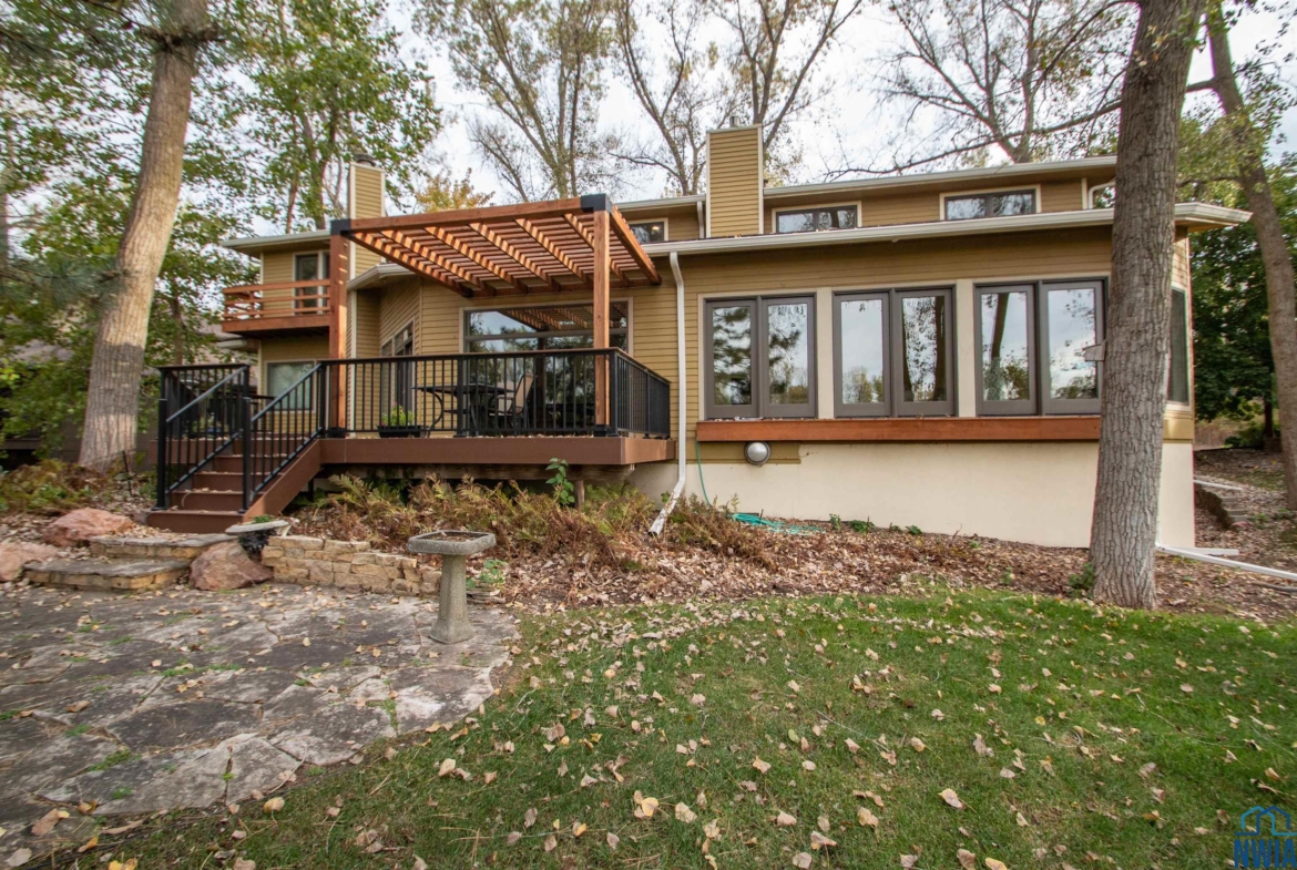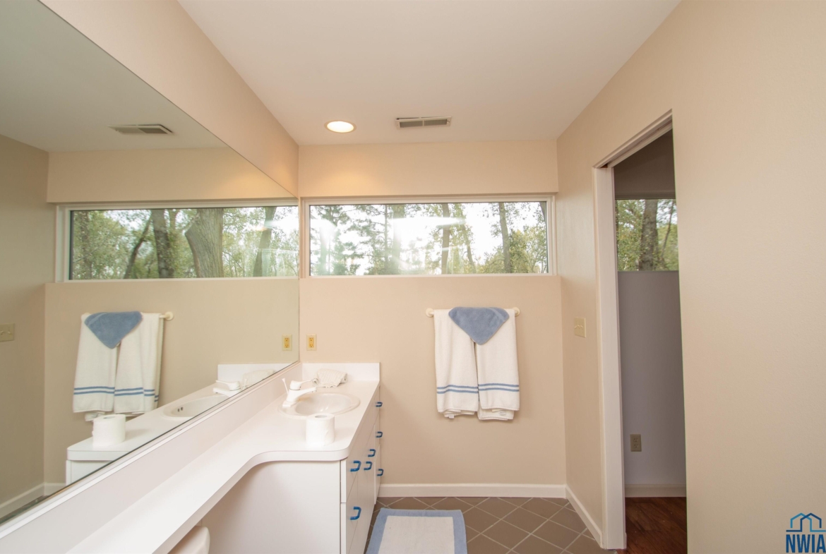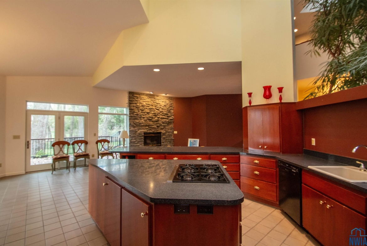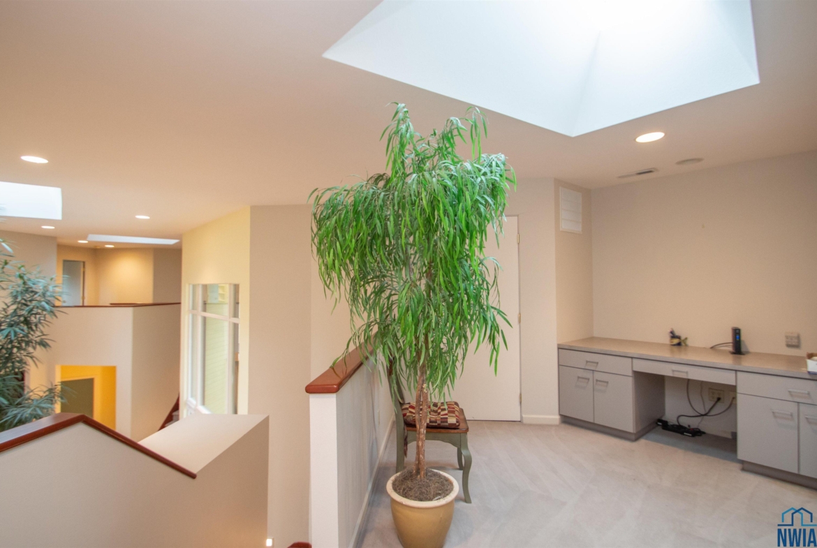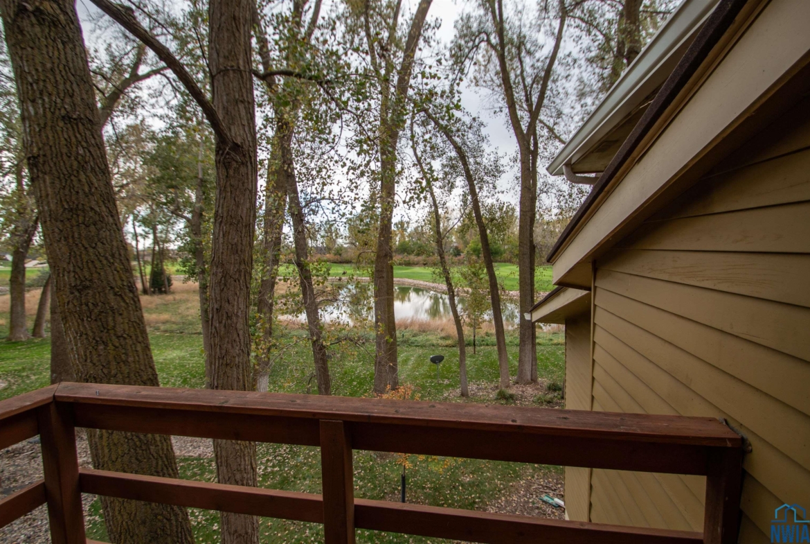 Tucked away on a wooded lot with pond & course views is this unique 1.5 story home with 4 ensuite bedrooms and 3 car garage. As you enter the 2 story foyer you will find an indoor garden area with drip line, 2 staircases, tile floor, skylight and a dbl closet for guests. Pocket doors lead to formal dining area with carpet. Vaulted ceiling in living room with wall of windows to those great views, and gas FP to curl up in front of. Casual dining area off the kitchen has floor to ceiling windows. tile floor and door to Brand New Trex Deck. Kitchen features cherry cabinets with an island, 2 Bosch DW, a gas cooktop, commercial fan, appliance center, warming drawer and a pantry. For more casual living there is a family room with wood floor, wood FP with tile hearth and stacked stone surround as well as a wet bar area. Through French doors to the master suite bedroom with gas FP, built in desk area and door to front of home. Retreat to the bathroom with tile floor, dbl vanity, jet tub, toilet/shower room, 10 x 6 WIC and door to new deck. Other side of home has a bedroom with dbl closet and door to a private deck. The 3/4 bathroom off this bedroom has a single vanity and can be accessed from the hall as well. Going up 1 of the front stairs is a 10 x 4 loft overlooking the entry and leads to a Junior Suite with bedroom with wood floor, door to Juliet balcony with pond view, a WIC and door to dry storage, a full bathroom and laundry area. Going up the other stairs is another 11 x 9 loft area, utility closet, and another Junior Suite with bedroom with carpet, door to Juliet balcony with pond view, a full bathroom with laundry area, 2 dbl closets and skylight. UPDATED FEATURES: Shingles replaced with steel roof 2015, new 6″ gutters with leaf guard, New concrete driveway & sidewalk 2025, New Trex deck on the back of the house 2023. New Pella windows main floor and second floor on the west side of house. FP: 2 gas-1 wood. 3 HVAC. $20,000 exterior paint allowance.