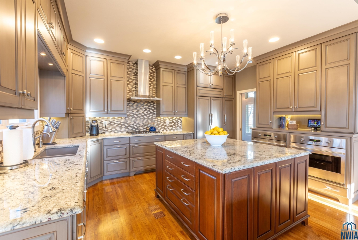KitchenMain15x12large island, double ovens, custom cabinetry, granite tops