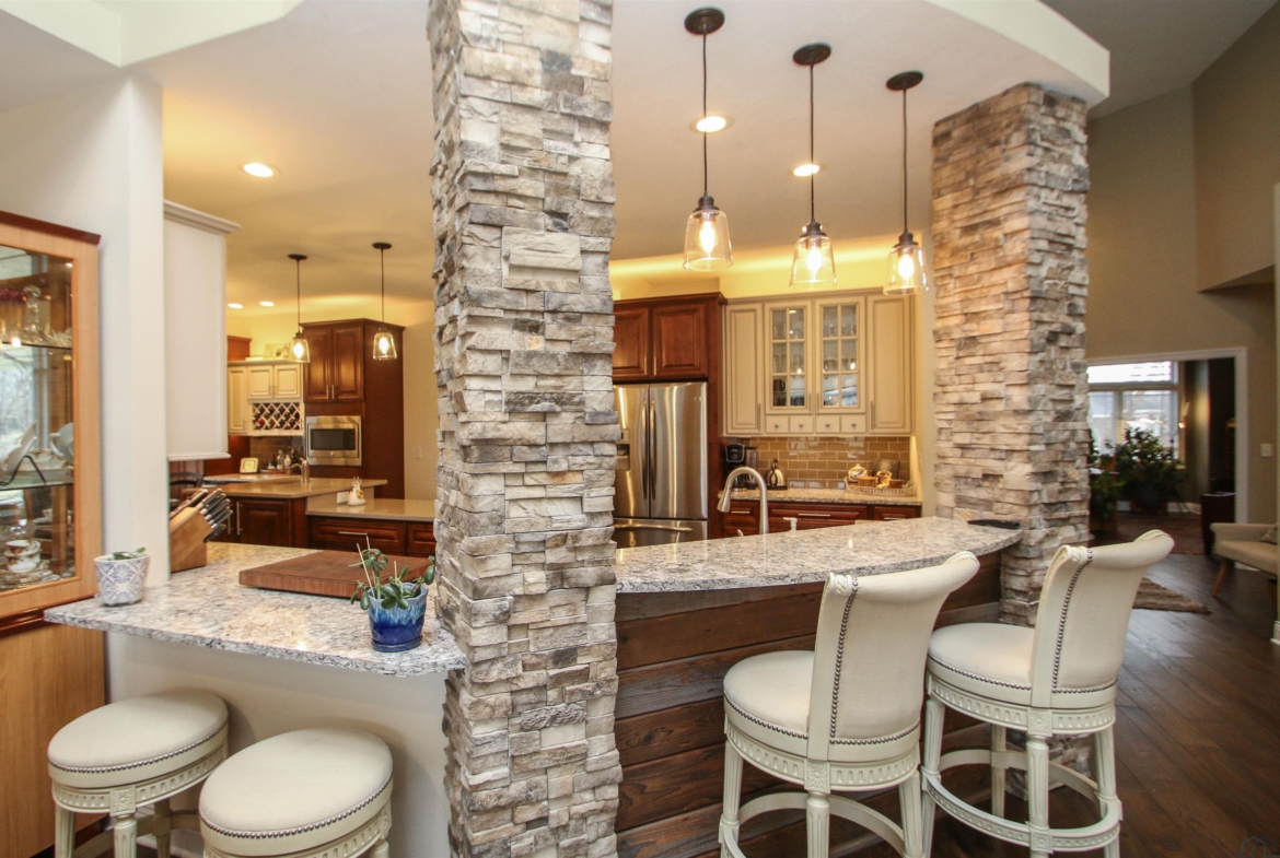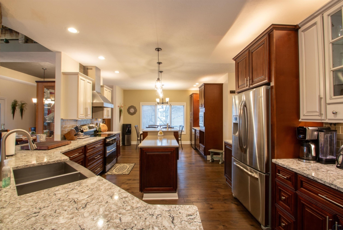 | Kitchen | Main | 24 x 13 + 10 x 6 | eat in, light & dark cabs, solid surface & quartz, custom |