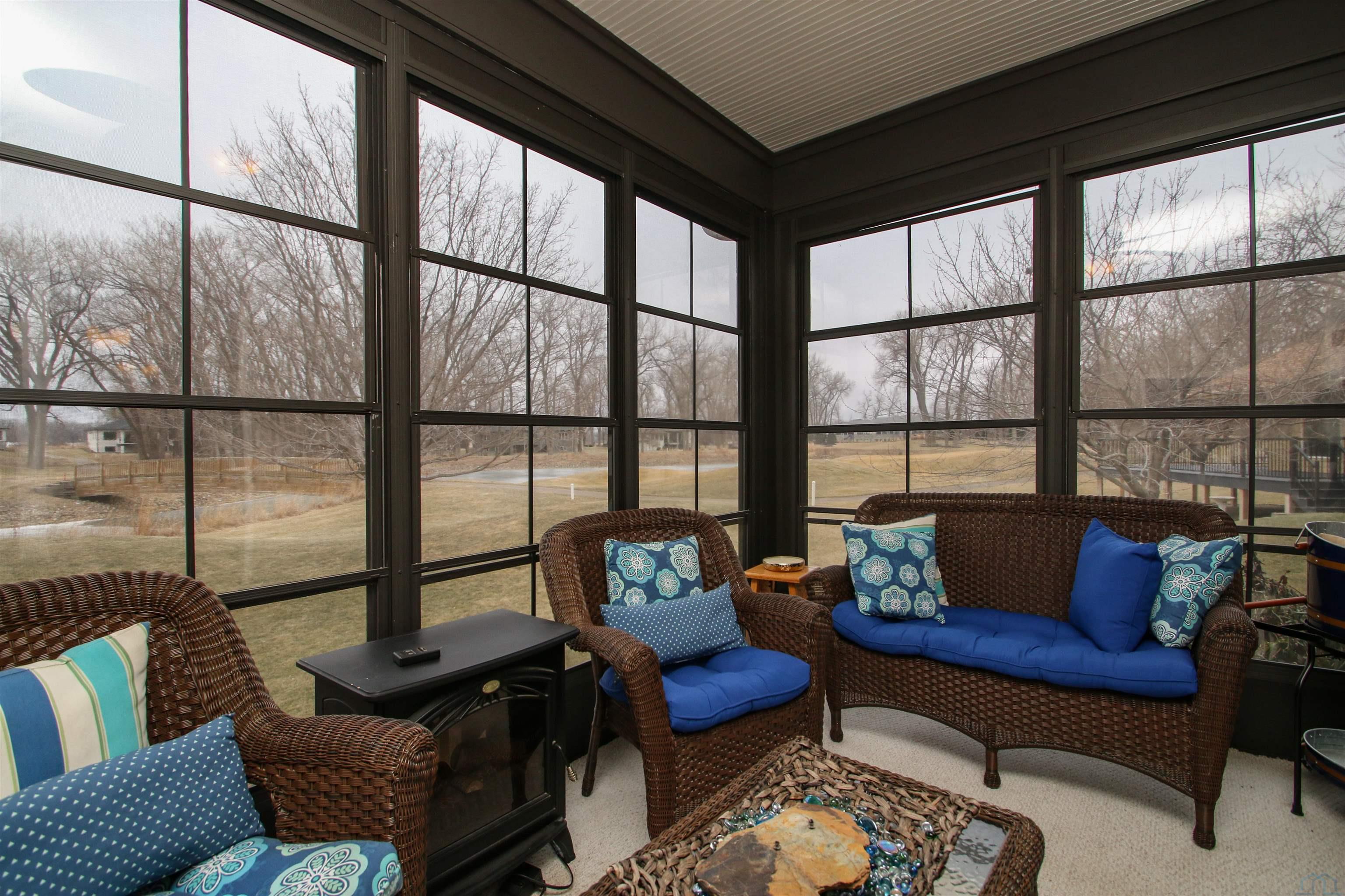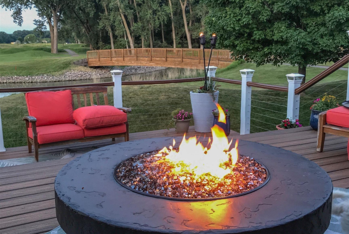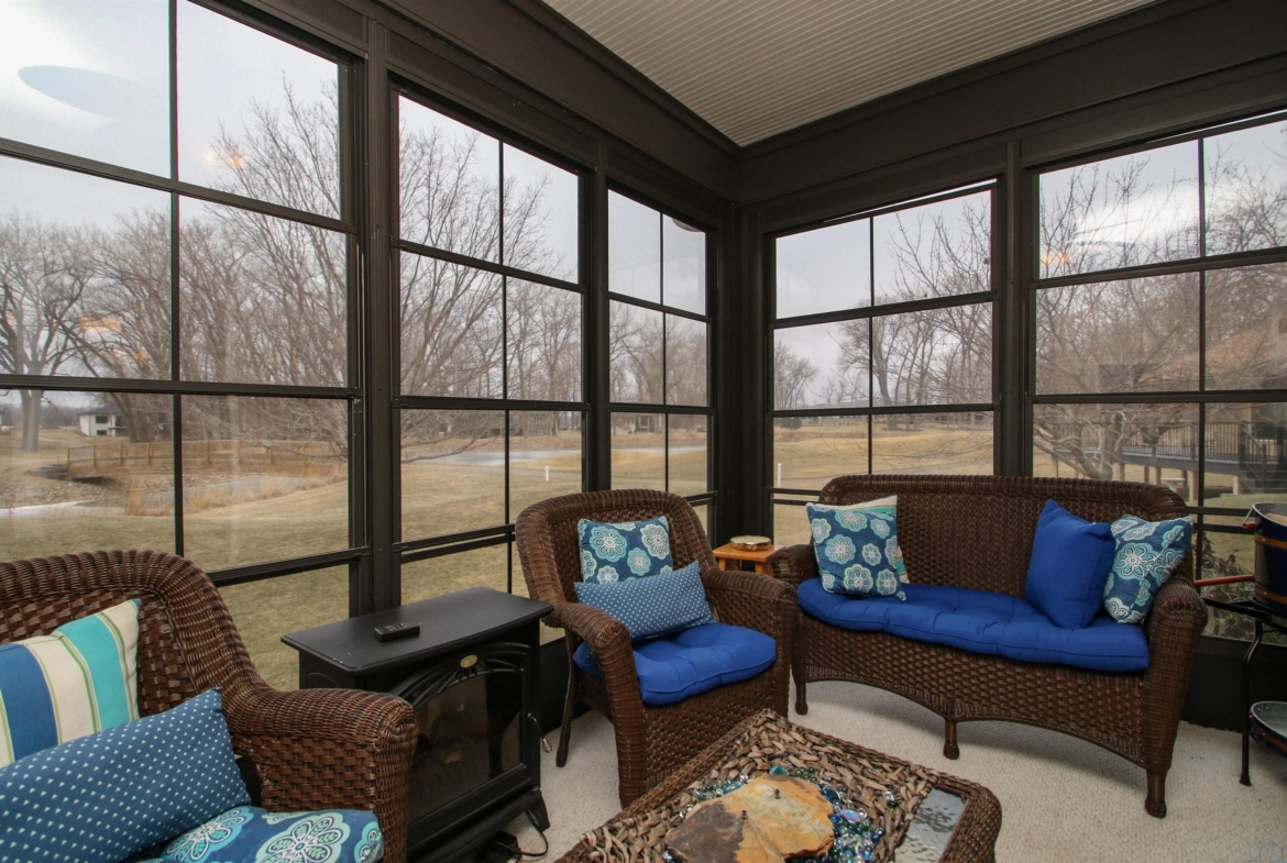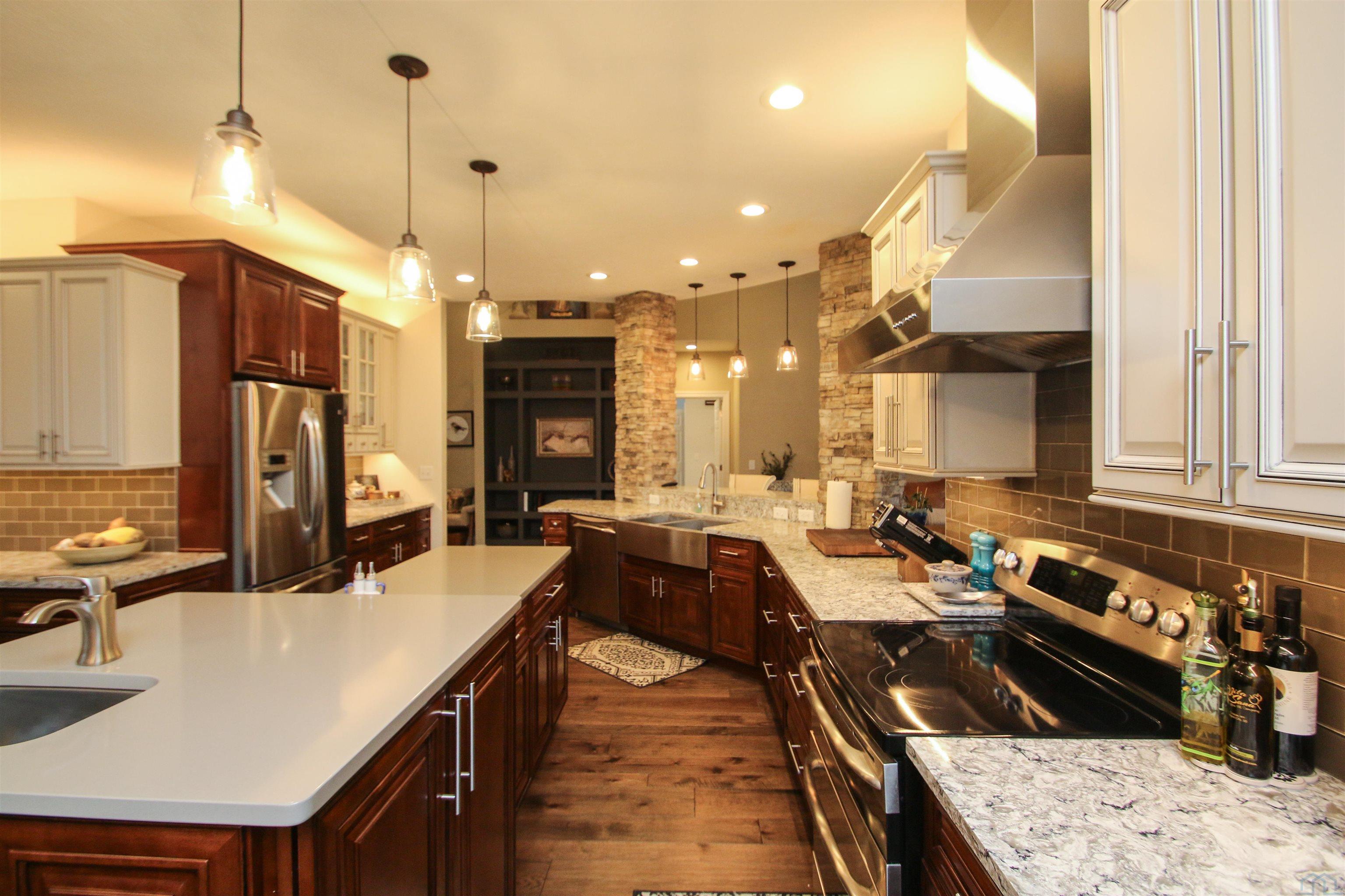 Tucked away at the end of a cul de sac with bridge and golf course views is this classy updated home with 3 bedrooms, 3 bathrooms and a 3 car garage. First impression: New garage doors, curbing(2018) & stained glass panel above the front door. Foyer features 16 ft ceiling, coat closet New decor shelves & chandelier. Engineered floor in foyer, den, living room, dining room, kitchen and halls. Den has closet with antique door. Great views of the signature # 5 hole & bridge from LR with vaulted ceiling. New gas FP with stacked stone, and decor shelves. Formal dining room has pop up ceiling and door to Screen Builders 3 season room with carpet, CF, electric heater, 2 screened walls with door to NEW 2 level composite deck with cable rail system & firepit. Great places to relax or entertain. Showstopper NEW kitchen features RTA custom built light and dark cabinets, solid surface counters, island with quartz counter, over & under cab lighting, SS double sink, eat in area, counter seating wet bar area, bar frig, pull out drawers. & many custom features. Convenient drop zone off garage door and an antique door on laundry room with hex tile floor and cabs w sink. Primary suite is a retreat with carpet, pop up ceiling and bay window. Custom features in the bathroom: NEW floating dbl vanity, full tile wet room with shower and soaking tub, toilet room with pretty light, heated floor, and skylight. 7×6 WIC and 3×4 cedar closet both with antique sliding doors. Completing main floor are 2 bedrooms each with carpet, dbl closets, CF and lots of windows and a NEW full bathroom with hexagon tile floor, warmer lights, tub/shower combo and skylight. Lower level has a family room with carpet and daylight windows, (2 person infrared sauna included) a flex room which could be an office/craft/workout room and a 3/4 bathroom with heated tile floor & dbl closet. Updates: 2017: Shingles, bay window in primary. New HVAC 2015 New kitchen 2016-17. New main bath: 2026.