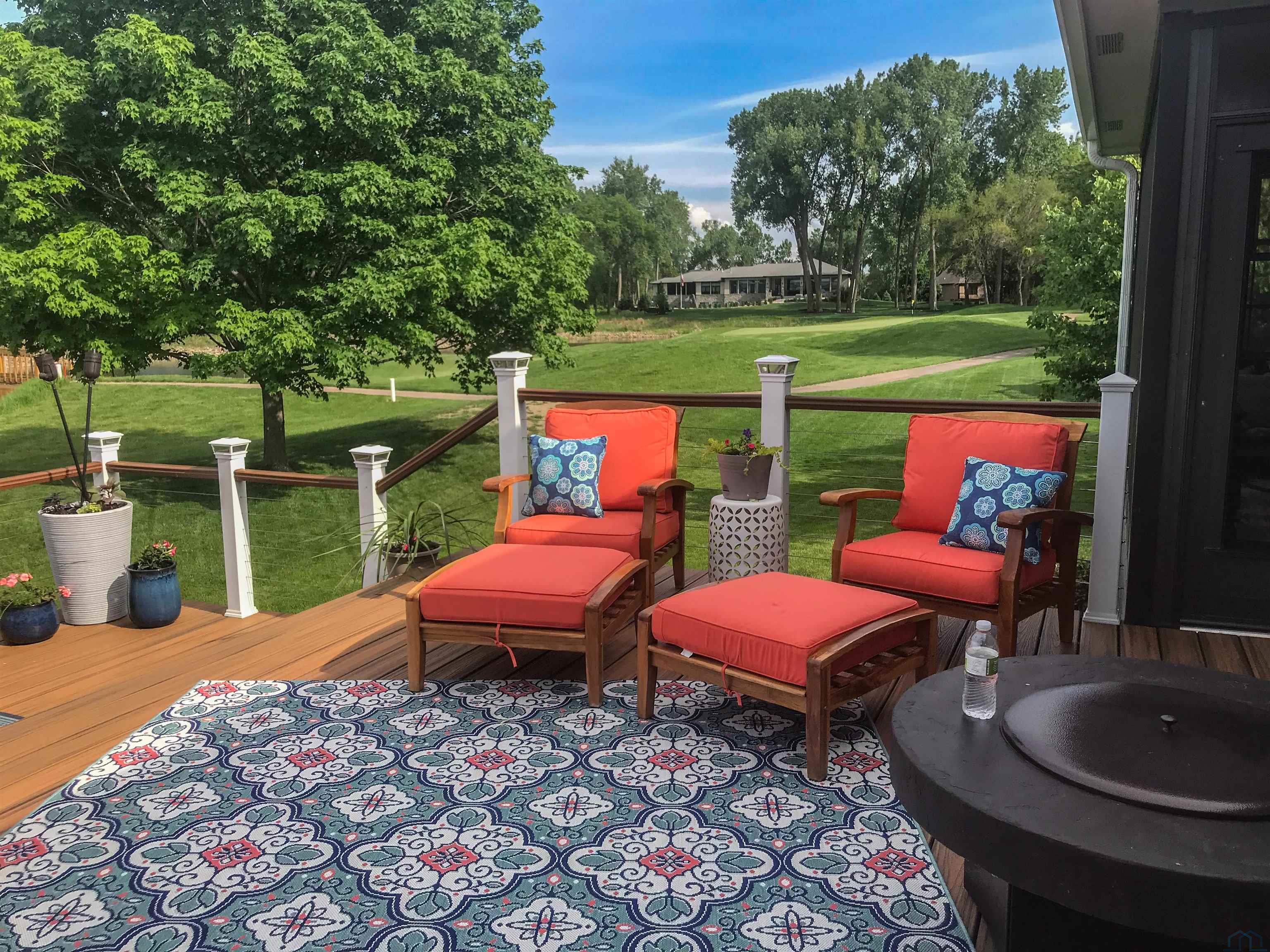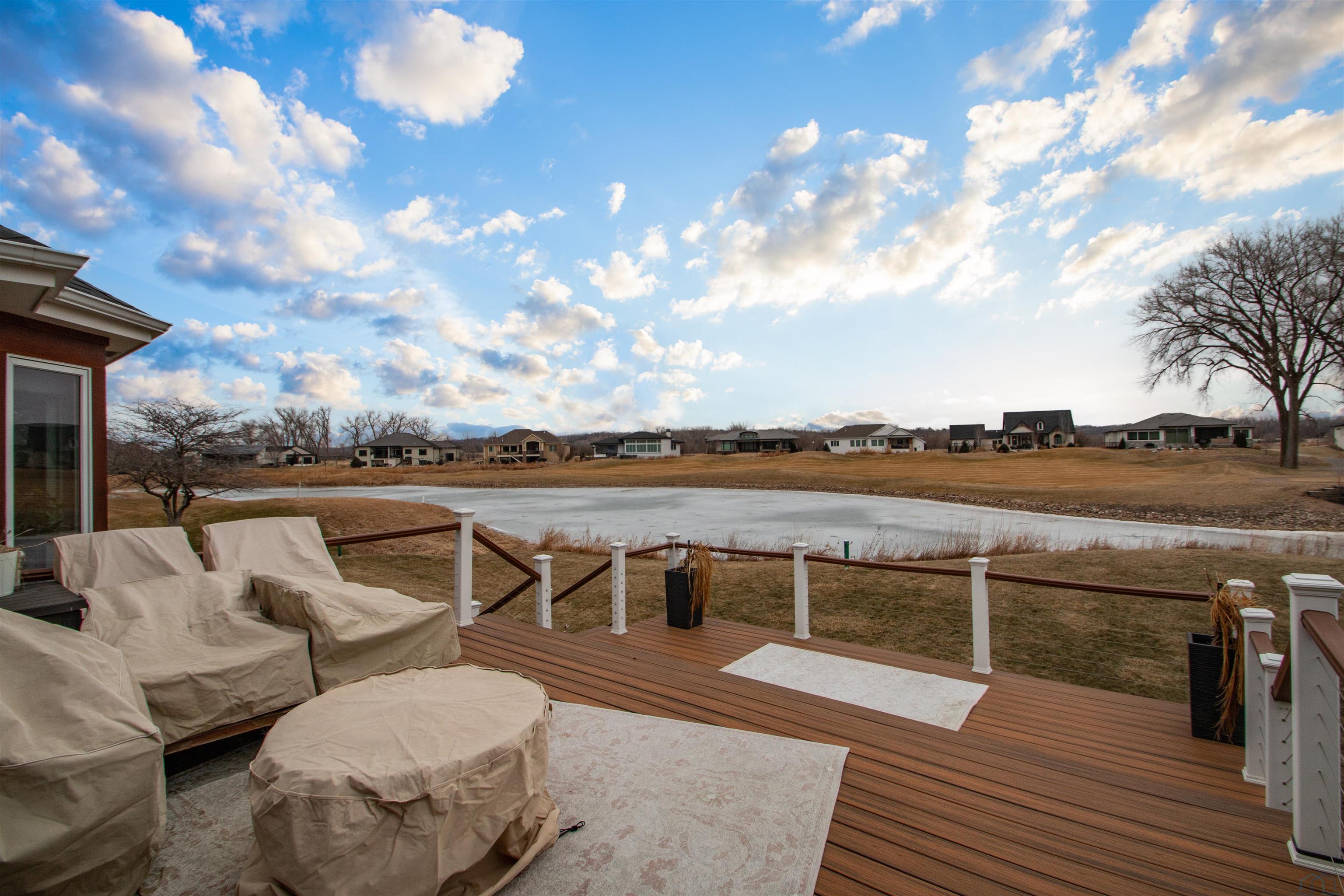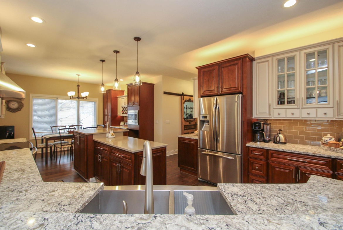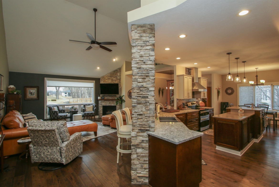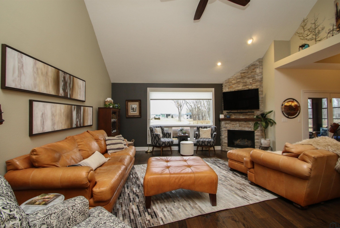 Tucked away at the end of a cul de sac with bridge and golf course views is this classy updated home with 3 bedrooms, 3 bathrooms and a 3 car garage. First impression: New garage doors, curbing(2018) & stained glass panel above the front door. Foyer features 16 ft ceiling, coat closet New decor shelves & chandelier. Engineered floor in foyer, den, living room, dining room, kitchen and halls. Den has closet with antique door. Great views of the signature # 5 hole & bridge from LR with vaulted ceiling. New gas FP with stacked stone, and decor shelves. Formal dining room has pop up ceiling and door to Screen Builders 3 season room with carpet, CF, electric heater, 2 screened walls with door to NEW 2 level composite deck with cable rail system & firepit. Great places to relax or entertain. Showstopper NEW kitchen features RTA custom built light and dark cabinets, solid surface counters, island with quartz counter, over & under cab lighting, SS double sink, eat in area, counter seating wet bar area, bar frig, pull out drawers. & many custom features. Convenient drop zone off garage door and an antique door on laundry room with hex tile floor and cabs w sink. Primary suite is a retreat with carpet, pop up ceiling and bay window. Custom features in the bathroom: NEW floating dbl vanity, full tile wet room with shower and soaking tub, toilet room with pretty light, heated floor, and skylight. 7×6 WIC and 3×4 cedar closet both with antique sliding doors. Completing main floor are 2 bedrooms each with carpet, dbl closets, CF and lots of windows and a NEW full bathroom with hexagon tile floor, warmer lights, tub/shower combo and skylight. Lower level has a family room with carpet and daylight windows, (2 person infrared sauna included) a flex room which could be an office/craft/workout room and a 3/4 bathroom with heated tile floor & dbl closet. Updates: 2017: Shingles, bay window in primary. New HVAC 2015 New kitchen 2016-17. New main bath: 2026.