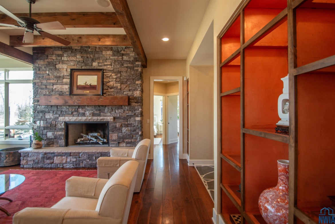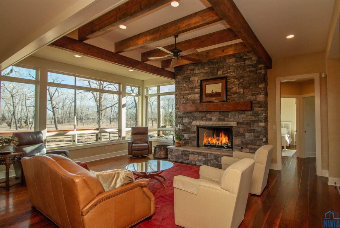 LivingMain21 x 15wb FP, Douglas fir beamed ceiling, 7" walnut plank floor.